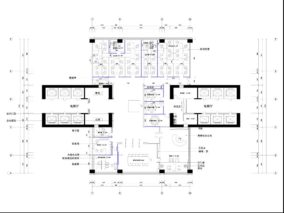 为此,本方案临走道的隔墙采用了双面108款玻璃隔断,为的是最大化的把自然光引进室内,图中表示,兰色线表达的是即将用高隔断的墙体。