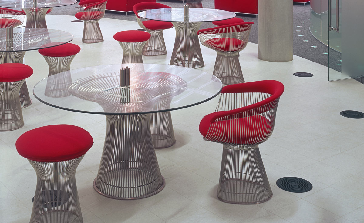 1966年榮獲 American Institute of Architects International Award 美國建築協會國際大獎的 Platner Chair,在設計師 Warren Platner 的創意下,將鋼絲雕塑轉化成一系列收藏級的傢俱,創造了現在被認為是當今時代的設計圖標。
