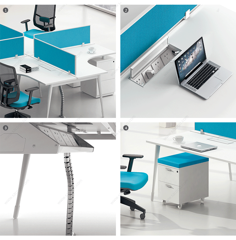 1、桌面吸音隔板,多种选择:板材、玻璃、亚克力、吸音板; 2、整齐划一、人性方便的桌面铝合金过线系统;
