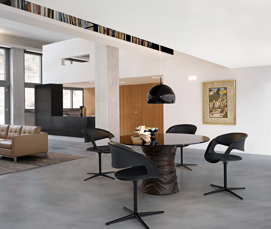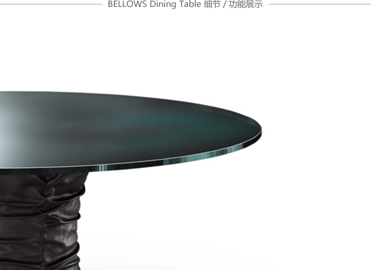 圆形茶几,这是一个家人、朋友聚在一起的地方,在这里,你们可以一起讨论一件事或者享受美食。最原始的欢乐。风箱式的餐桌体现了魅力和生活态度。柔软的皮革和玻璃搭配,稳定的底座和精致的桌面,温暖而凉爽的材料组合在一起创造出独特的效果。