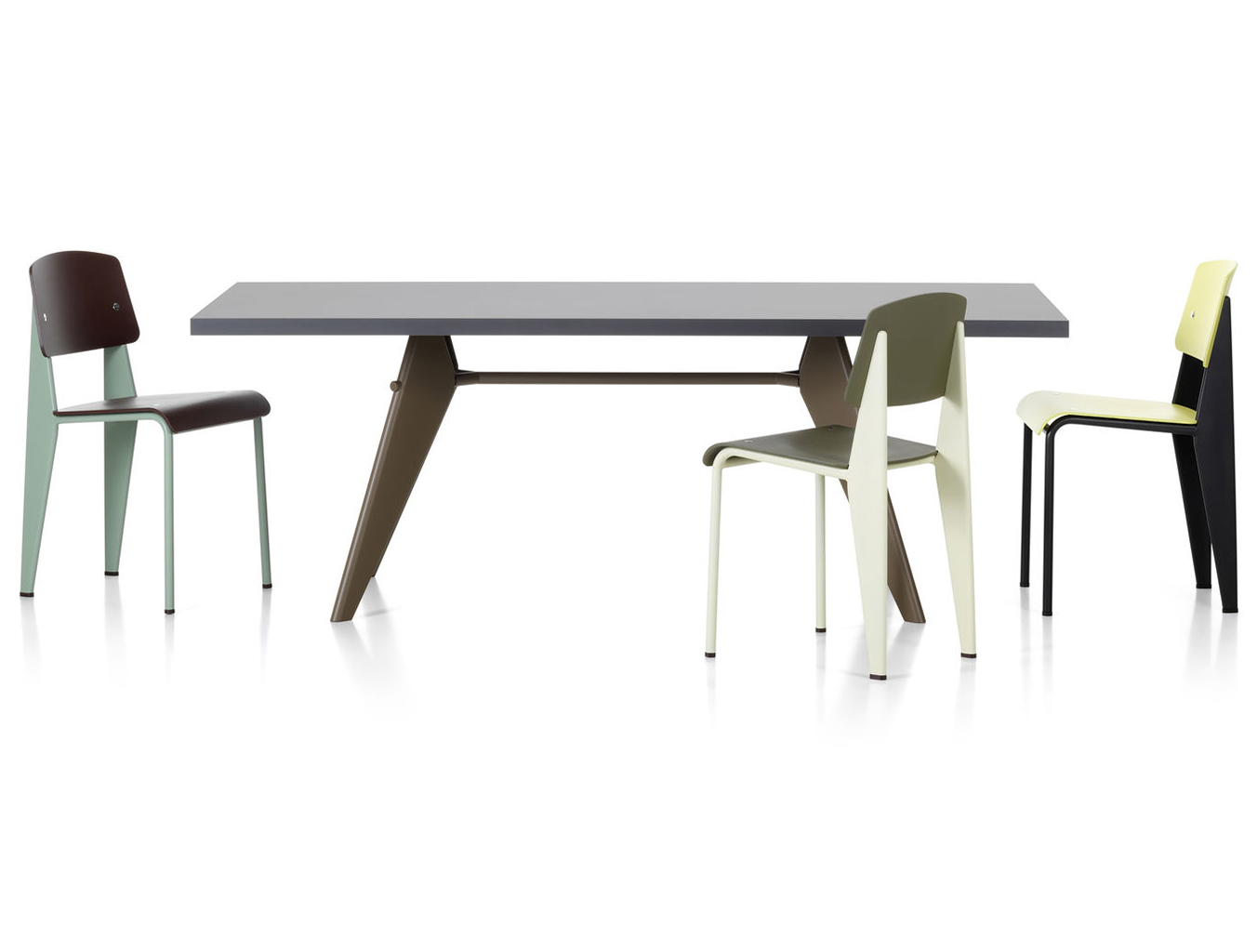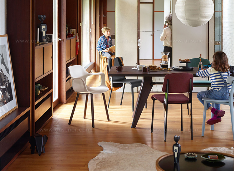 JeanProuvé的EM Table的美学外观坚持结构原则,说明其结构中的力和应力流动。 它有各种尺寸,桌面采用优质实木或HPL层压板,颜色可供选择。 长度为2000或2400毫米的顶部也有橡木贴面。 由于这种广泛的选择,每个餐厅都可以找到理想的EM Table。