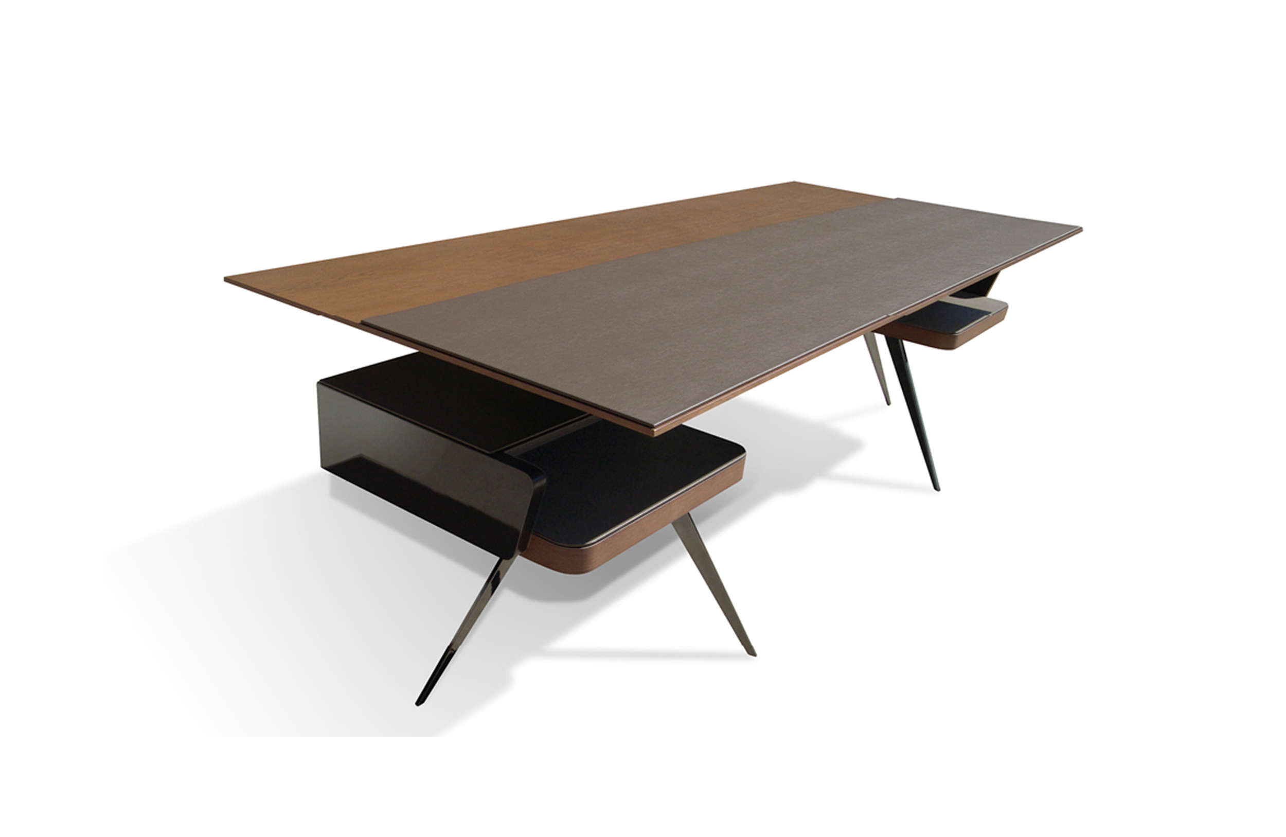 带有工作桌面区域的矩形桌子,装饰有Techno Leather。桌子显然是一个前板,桌子上有一个巨大的抽屉,桌子长度相同。抽屉的顶部和底部采用Techno Leather制成,并在餐具柜上采用天然木材或漆面处理。整体由两个金属结构支撑,有三个倾斜的腿。
