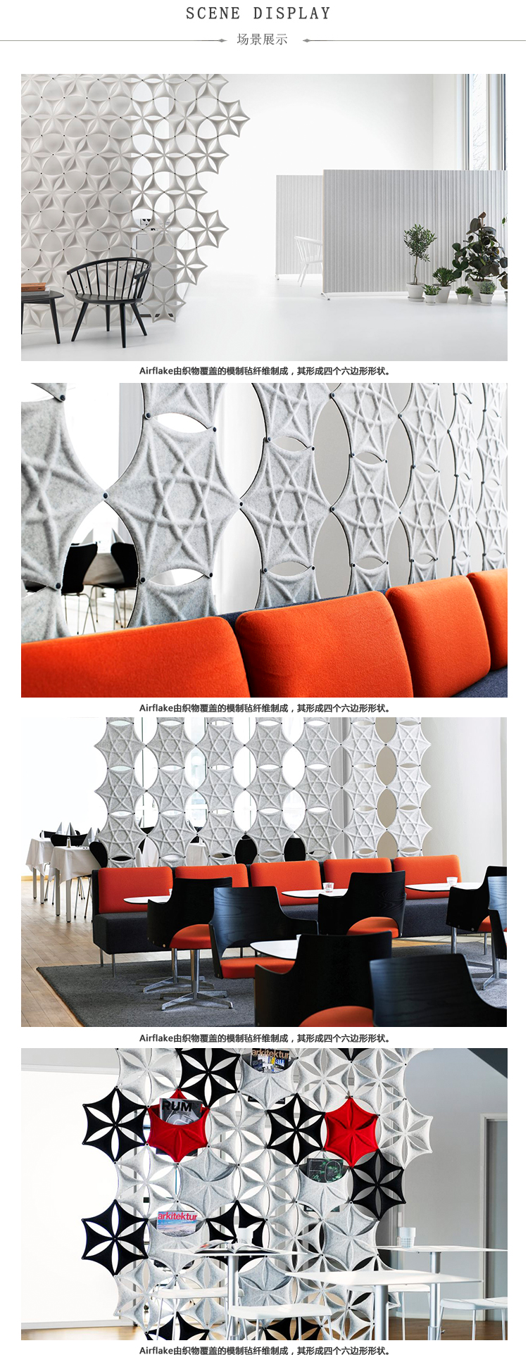 Aiflake / Airflake XL是一种基于六边形的模块化系统,可以自由组合以形成悬挂式隔断。Airflake散发出令人不快的声音反射,非常适合拥有大型开放区域的房间。Airflake由模制纤维毡制成。模块可以与塑料夹连接以产生不同类型的图案形成。使用直的或弯曲的白色或银色阳极氧化铝导轨,电线或假天花板固定在天花板或墙壁上