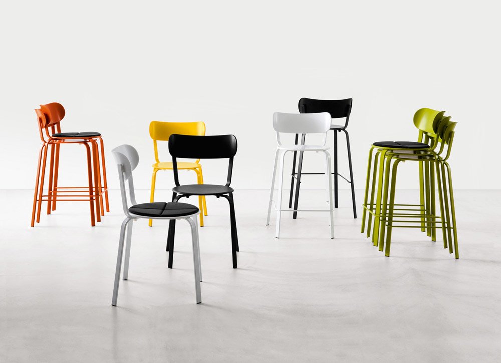 椅子和凳子- -小酒馆机型,STIL收集的光当代版本是一个非常时髦一项所述的单一材料,金属和明亮的颜色的播放允许无数组合和组合物。