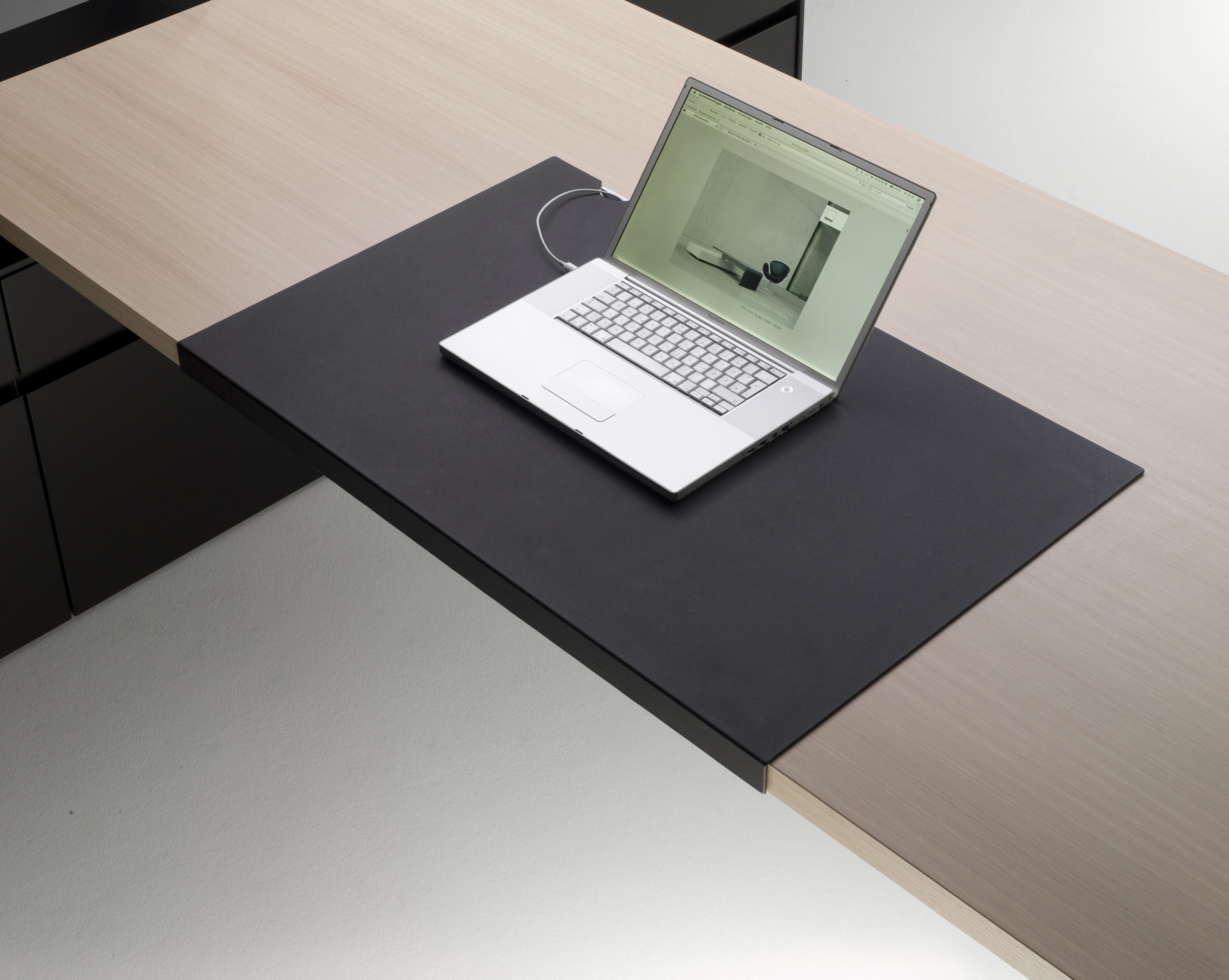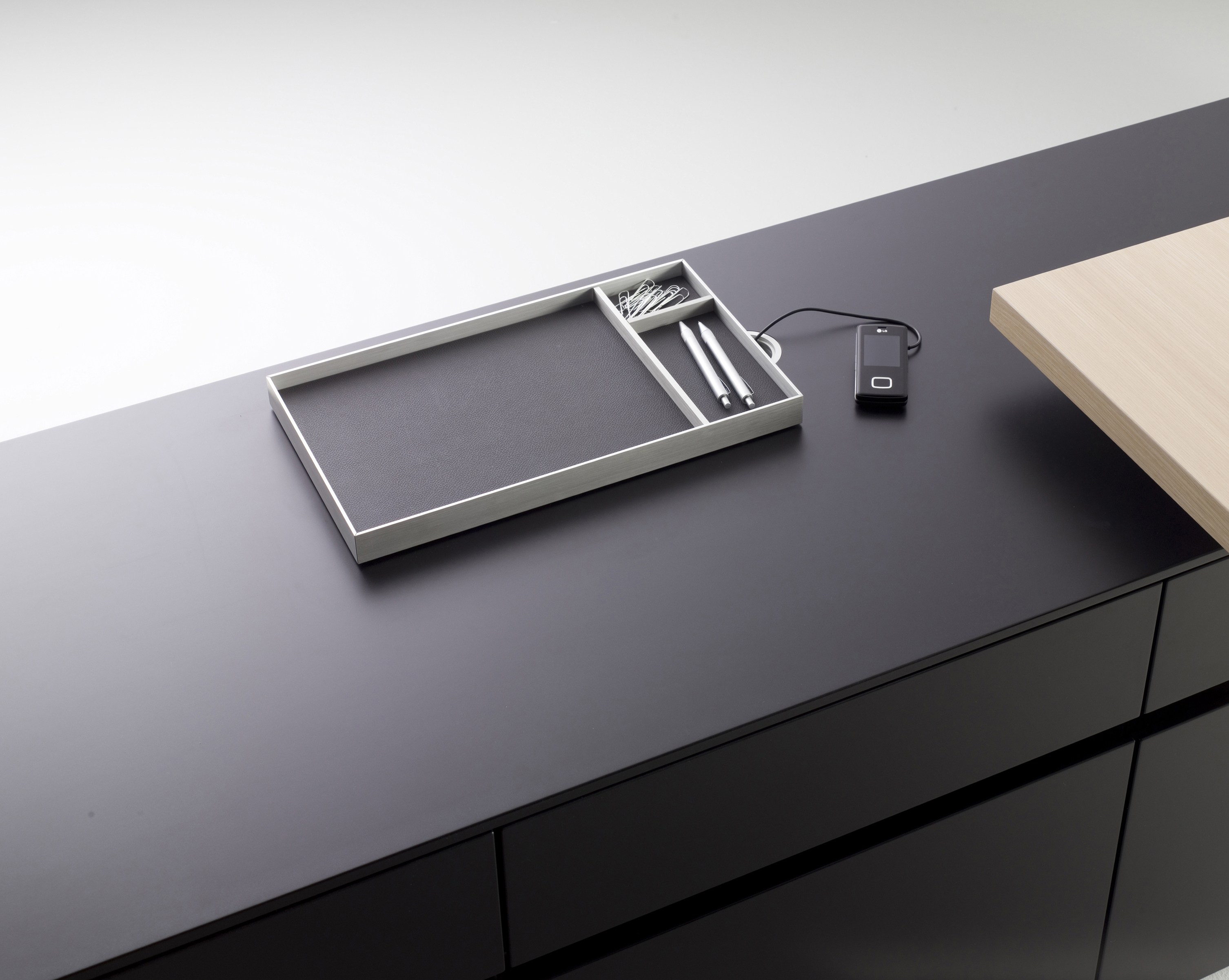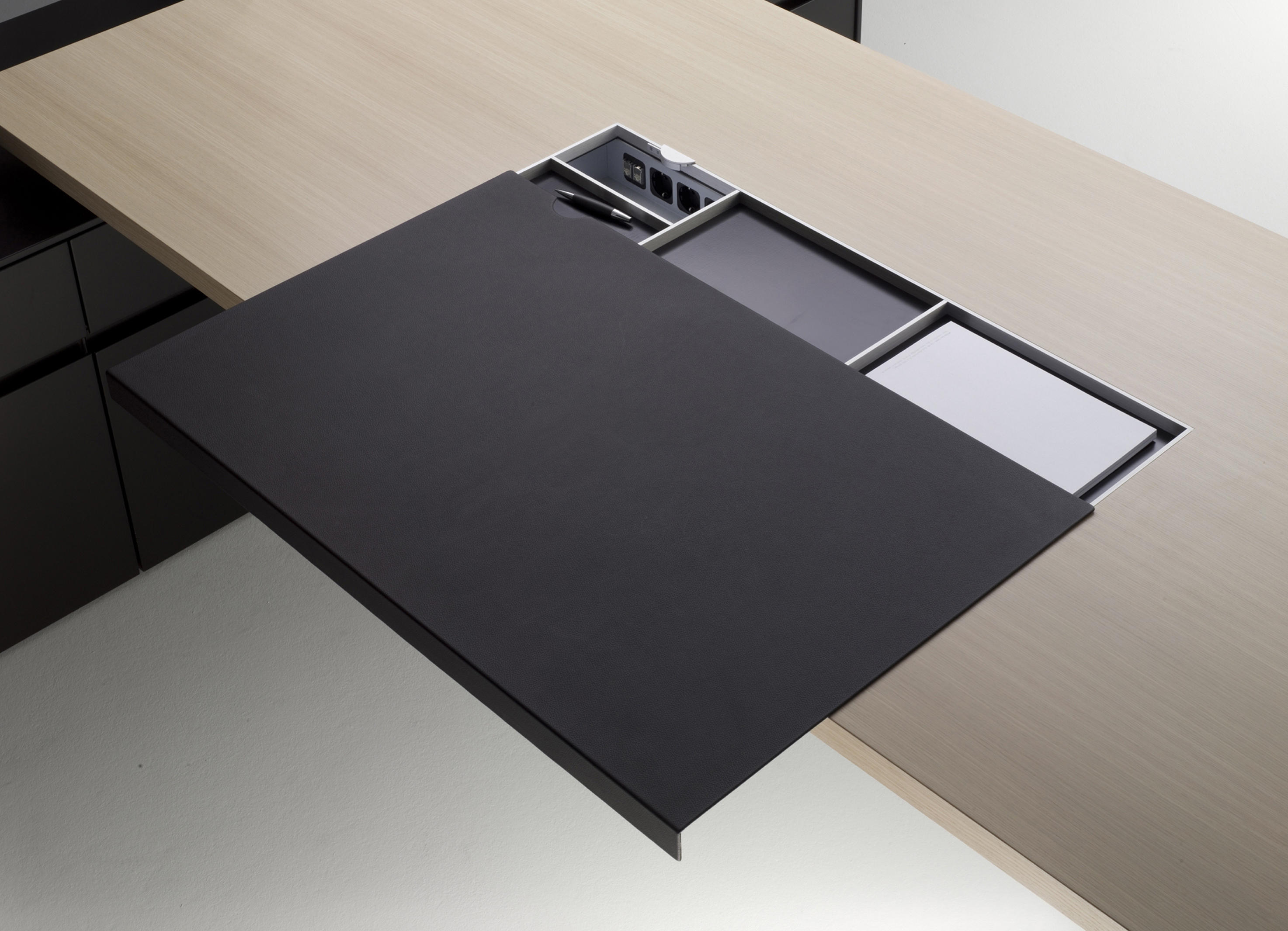 桌面带滑动真皮垫,内部隐藏了笔盒、纸盘及走线等功能