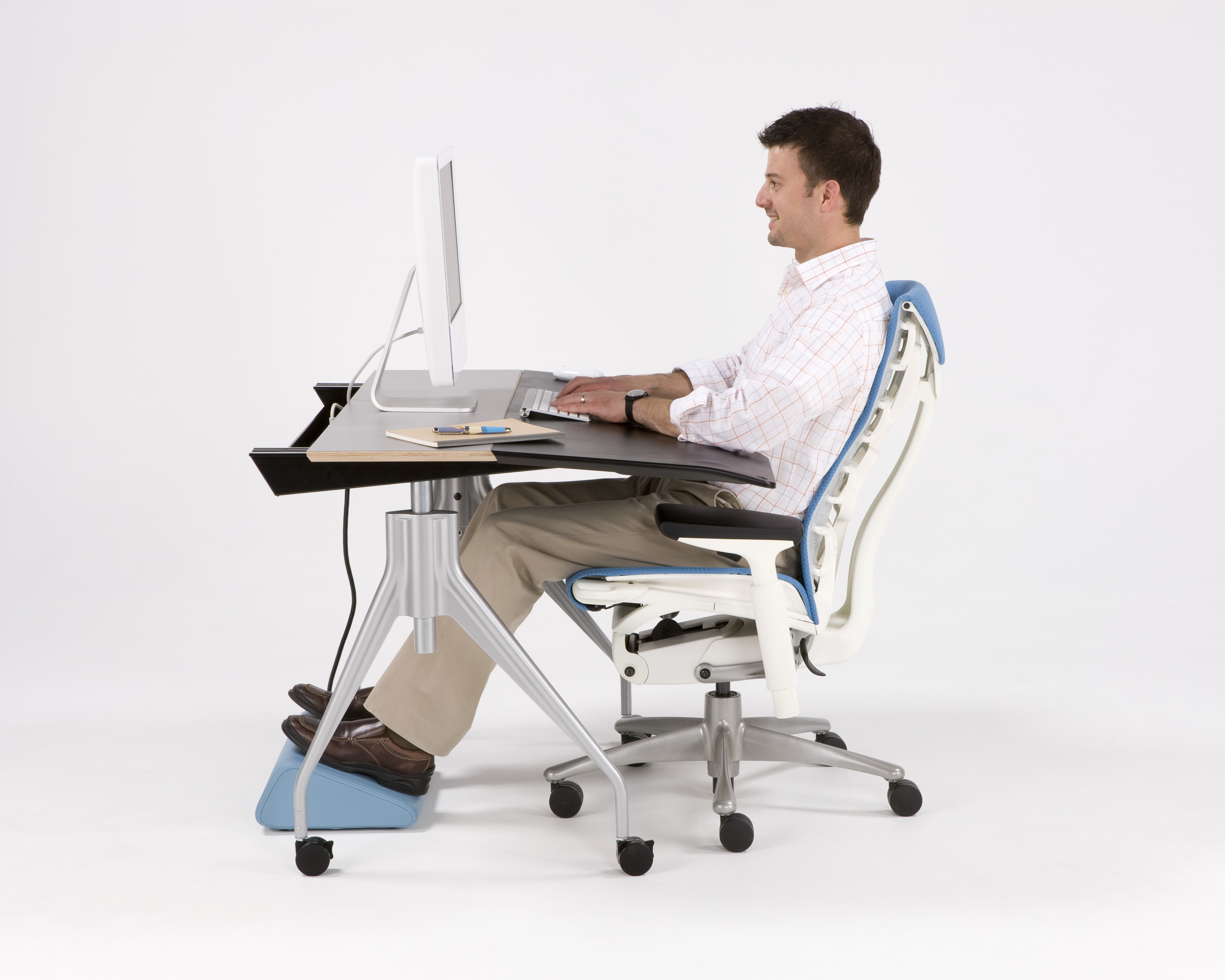 Embody的概念从一个业界未能克服的问题开始:人与科技之间缺少的实质和谐。我们身体的构造本来就是需要活动的。可现今人们长时间使用电子设备,手指以外的部位少有活动,而致使身体僵硬和疲惫。透过Embody,设计师Bill Stumpf和Jeff Weber着手解决这一问题。