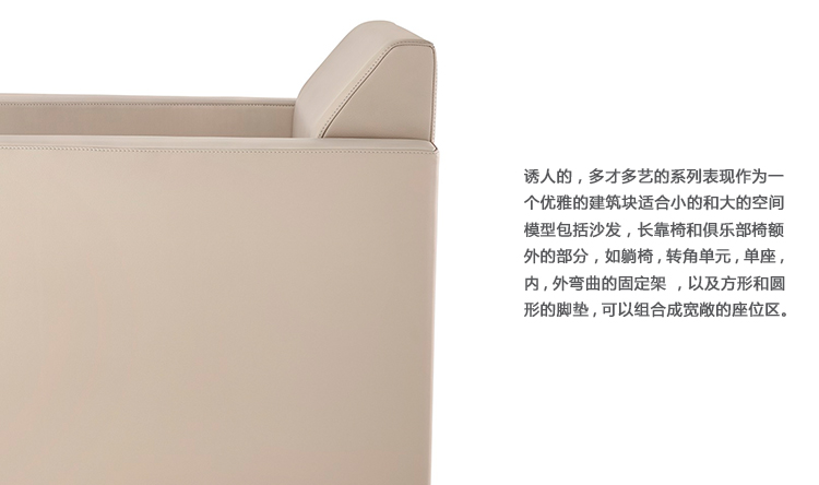 该诱人的,多才多艺的系列表现作为一个优雅的建筑块适合小的和大的空间。模型包括沙发、长靠椅和俱乐部椅。额外的部分,如躺椅、转角单元、单座、内、外弯曲的固定架,以及方形和圆形的脚垫,可以组合成宽敞的座位区。斜角可选择的纺织品和皮革选择,有一个定制的外观和紧凑的人性化尺寸,可轻松跨越住宅和商业内部。