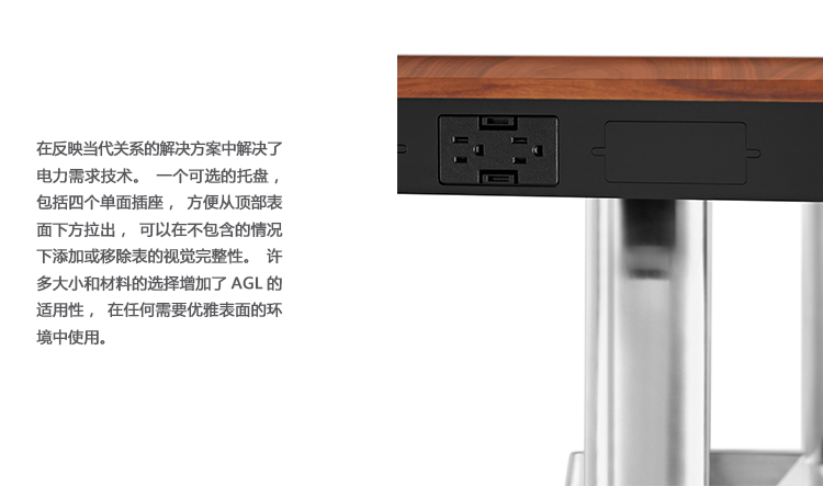 通过一项能够反映人与技术的互补联系的解决方案解决能源需求的问题。可选的托盘包括四个简单的插座,可以方便地从桌子底下拉出来,还可以在无损桌子的视觉整体性的前提下添加或拆除。AGL桌子系列有各种各样的尺寸和材质可供选择,无论应用到哪种场合,其优雅的外型都能与周围环境相得益彰。