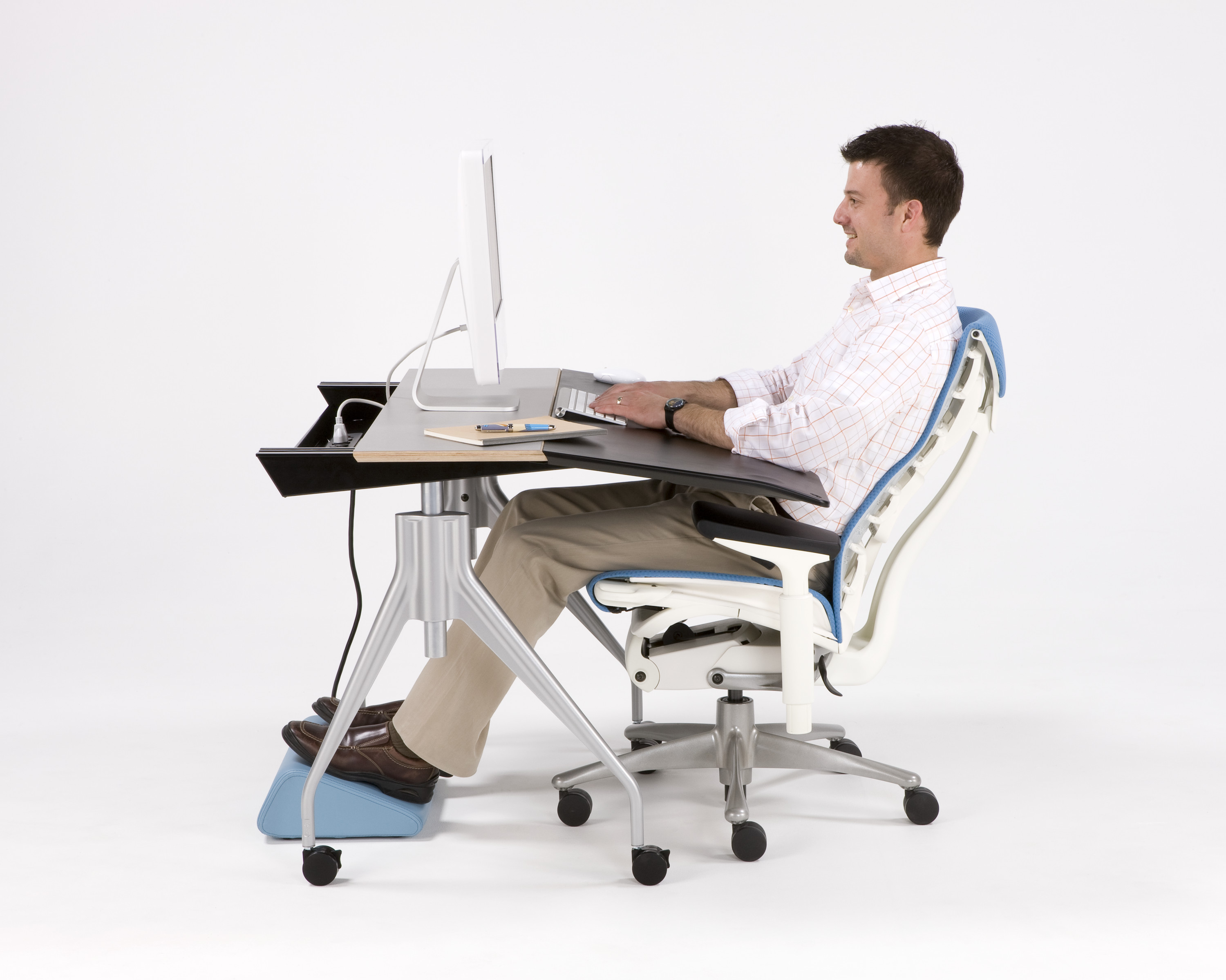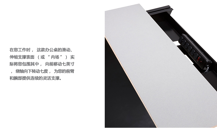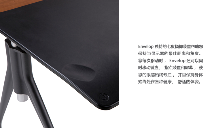 人会动,座椅也会动,为什么桌子就不能动呢?Envelop有着灵活的工作台面,在工作时可以滑动将您包围,是首款帮助您、座椅、工作台面和您的技术协调工作的办公桌。可使用标准销轴高度调节或坐姿-站姿高度可调桌腿,Envelop可以全面支持健康的坐姿与站姿。