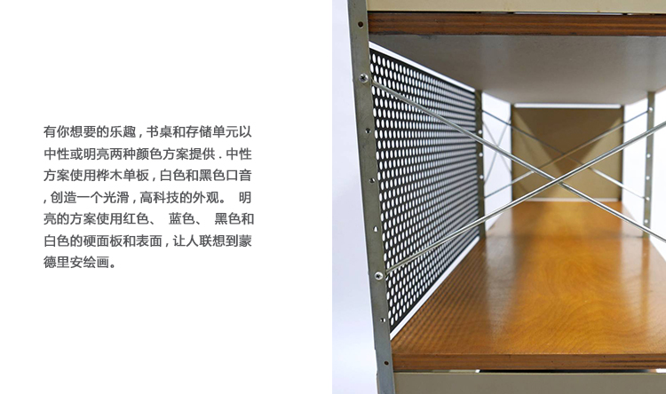 Eames存储单元由五种配置和四种大小的箱子、橱柜和抽屉组成。立柱、交叉支撑板和穿孔板要么是镀锌的,要么是黑色的;橱柜的正面是凹凸不平的胶合板;抽屉的正面和架子是模制的胶合板;箱体侧面和背面的面板是涂硬木的。可供您选择两种配色方案:中性色或亮色。