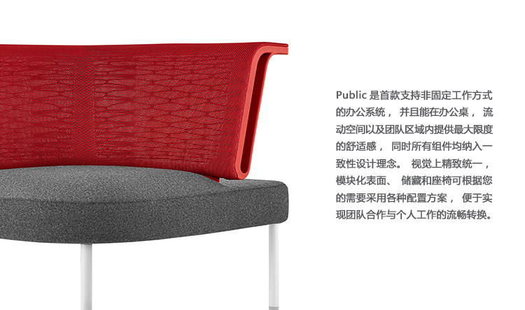 Public是首款支持非固定工作方式的办公系统,并且能在办公桌,流动空间以及团队区域内提供最大限度的舒适感,同时所有组件均纳入一致性设计理念。视觉上精致统一,模块化表面、储藏和座椅可根据您的需要采用各种配置方案,便于实现团队合作与个人工作的流畅转换。