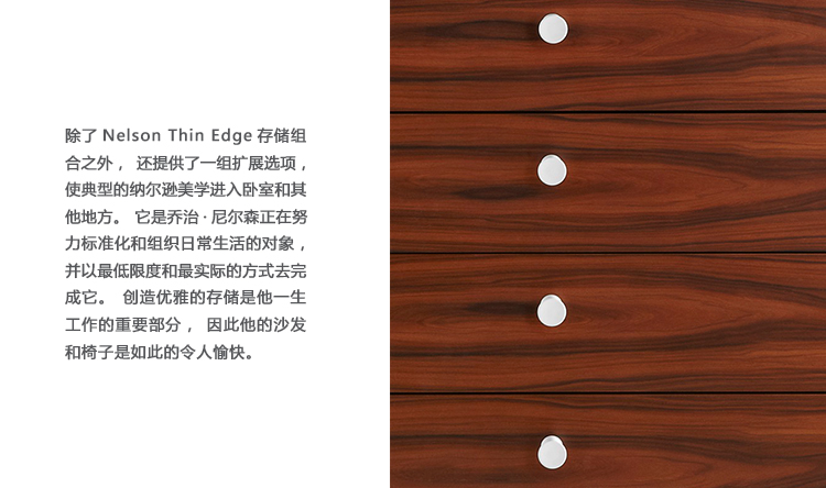 除了Nelson Thin Edge存储组合之外,还提供了一组扩展选项,使典型的纳尔逊美学进入卧室和其他地方。 它是乔治·尼尔森正在努力标准化和组织日常生活的对象,并以最低限度和最实际的方式去完成它。创造优雅的存储是他一生工作的重要部分,因此他的沙发和椅子是如此的令人愉快。