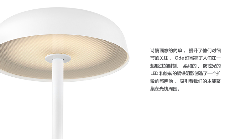 Ode Lamps秉承简约风格,注重细节,为人们共同度过的时光锦上添花。 柔软的防眩光LED和旋转钢制色调营造出一团散射照明,吸引我们的本能,围绕光线聚集在一起。