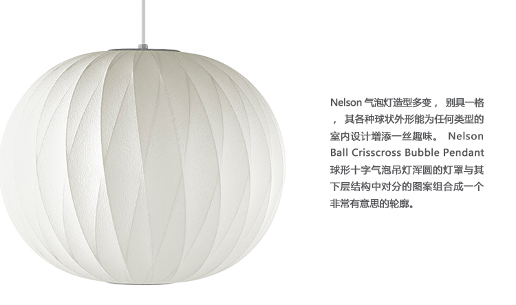 Nelson气泡灯造型多变,别具一格,其各种球状外形能为任何类型的室内设计增添一丝趣味。Nelson Ball Crisscross Bubble Pendant球形十字气泡吊灯浑圆的灯罩与其下层结构中对分的图案组合成一个非常有意思的轮廓。1952年,Nelson看到一组配有精心制作的丝质灯罩的瑞典吊灯,由此触发了自己的灵感。然而,吊灯的价格实在让人望而却步。Nelson决定设计制作自己的灯组,并且想出了用透明塑材代替真丝的创新工艺,使其能拥有更实惠的价格。