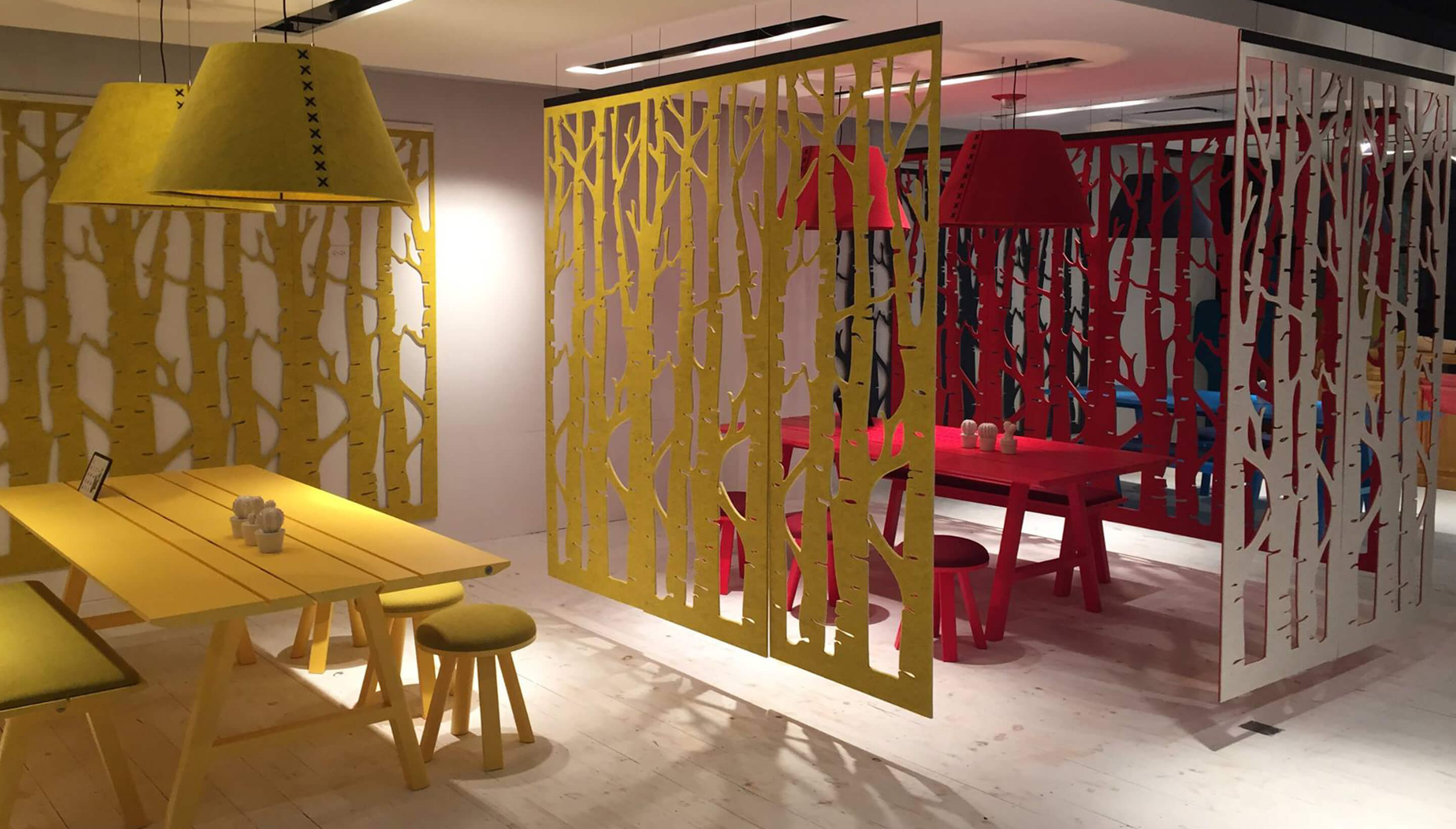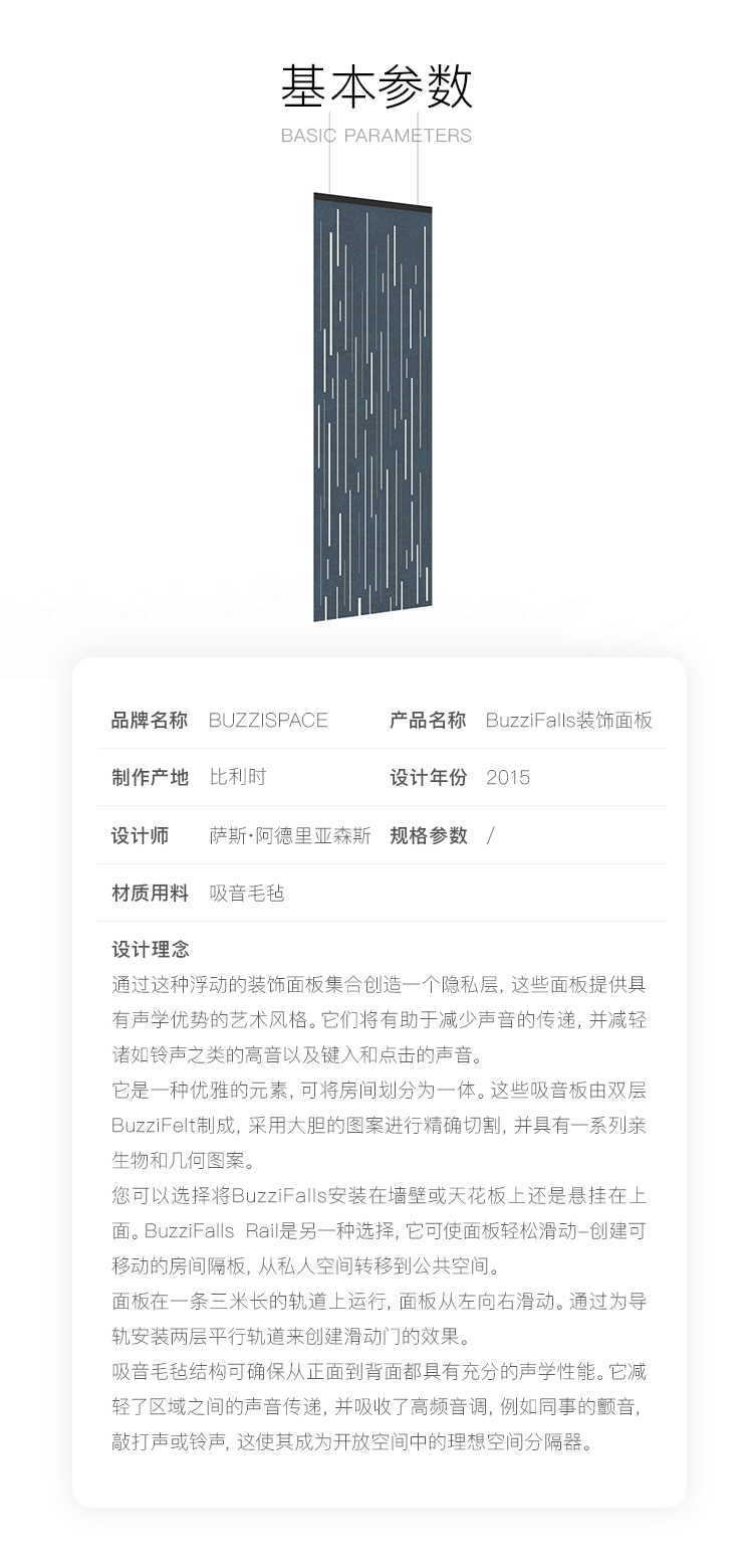 通过这种浮动的装饰面板集合创造一个隐私层,这些面板提供具有声学优势的艺术风格。它们将有助于减少声音的传递,并减轻诸如铃声之类的高音以及键入和点击的声音。它是一种优雅的元素,可将房间划分为一体。这些吸音板由双层BuzziFelt制成,采用大胆的图案进行精确切割,并具有一系列亲生物和几何图案。 您可以选择将BuzziFalls安装在墙壁或天花板上还是悬挂在上面。BuzziFalls Rail是另一种选择,它可使面板轻松滑动-创建可移动的房间隔板,从私人空间转移到公共空间。 面板在一条三米长的轨道上运行,面板从左向右滑动。通过为导轨安装两层平行轨道来创建滑动门的效果。 使用可用的新材料选项BuzziFelt Printed将BuzziFalls提升到一个新的水平 。如果您无法决定自己的喜好,请从10张照片中进行选择,并选择一张或两张照片的组合来选择不同的外观。 吸音毛毡结构可确保从正面到背面都具有充分的声学性能。它减轻了区域之间的声音传递,并吸收了高频音调,例如同事的颤音,敲打声或铃声,这使其成为开放空间中的理想空间分隔器。