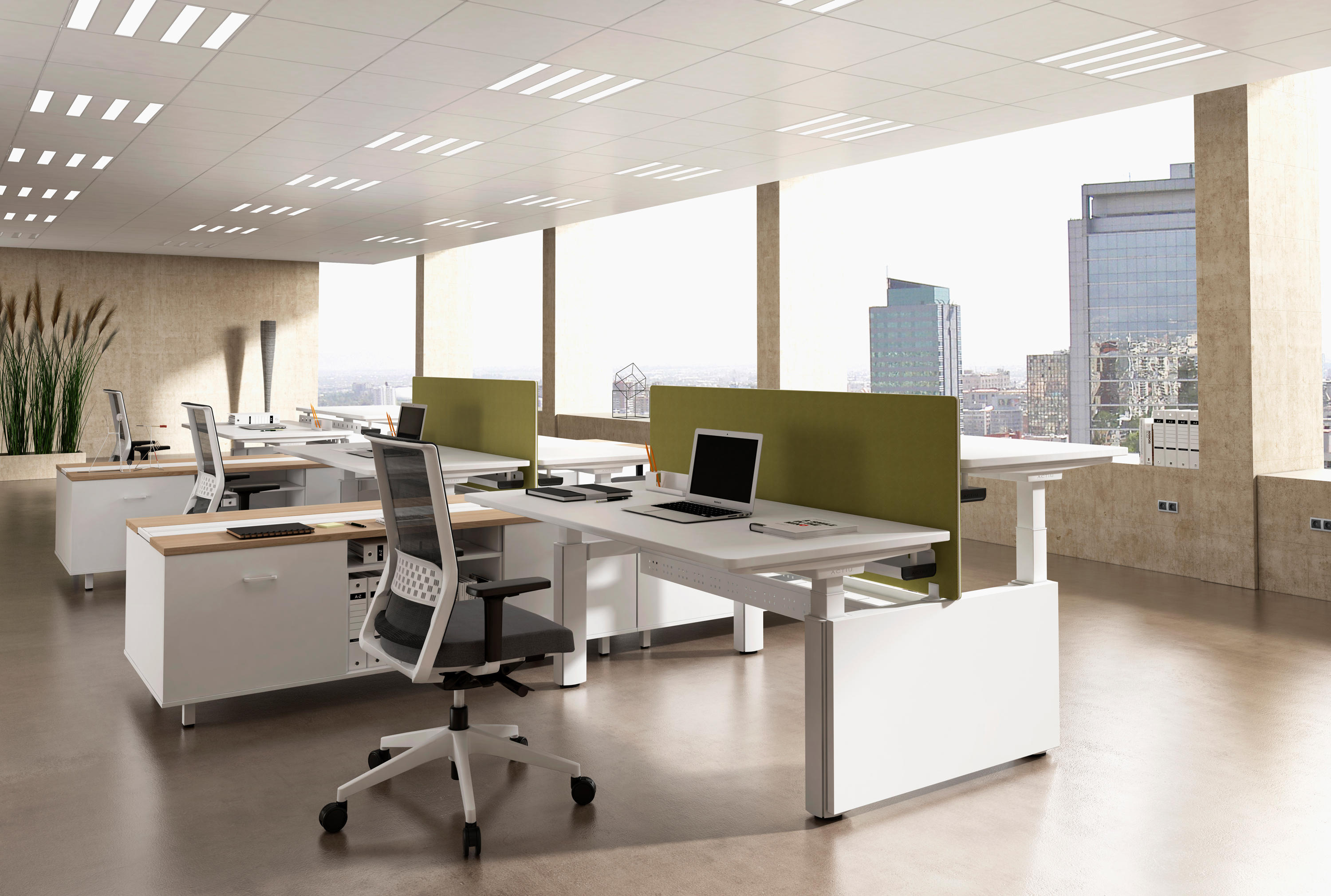 双人桌上配备了中央托盘式电缆桥架,软垫隔板和桌面上的电脑屏幕有20 至 40毫米的距离,有良好的隔音性能