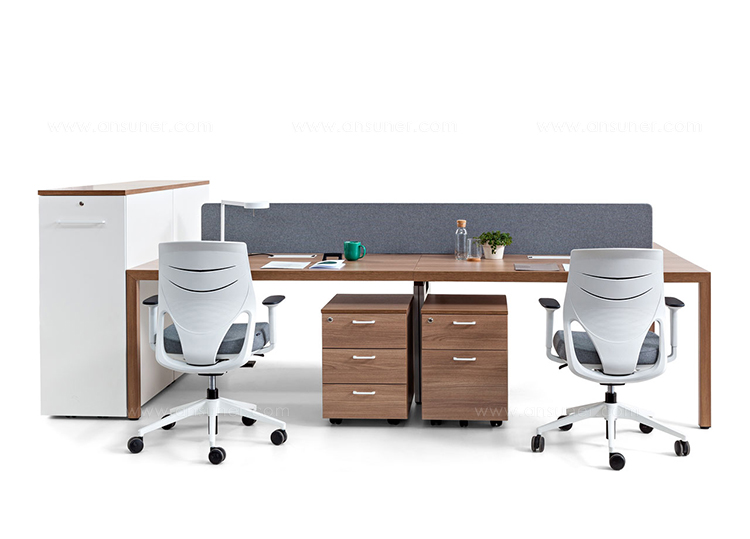 三聚氰胺制成的桌面由50mm ABS塑料封边,软垫形的隔音材料屏幕固定在办公桌面上,提供“T”、“M”和“F”等类型织物以供选择