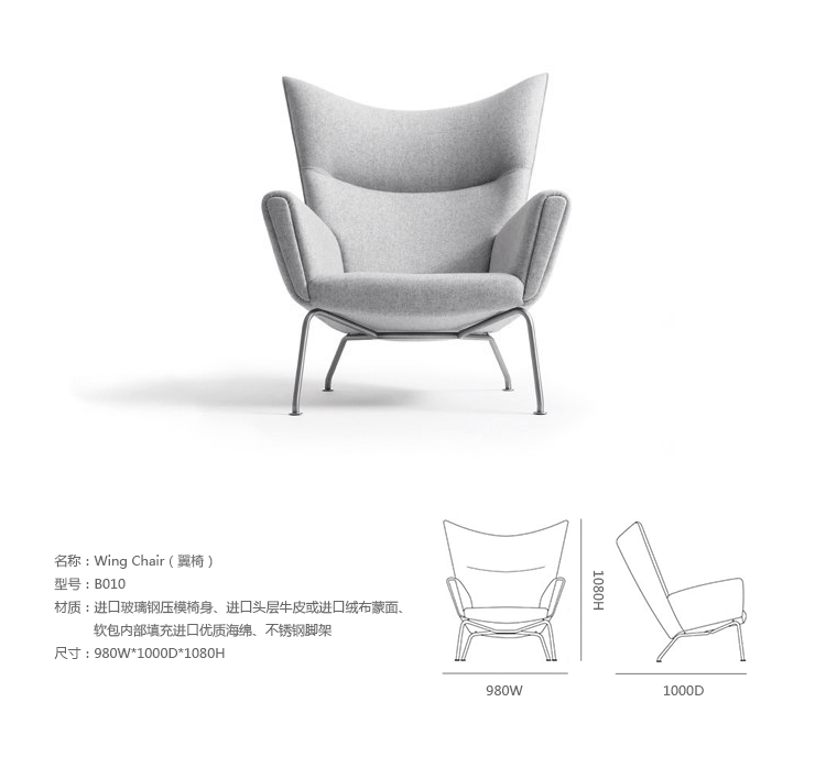 Wing Chair 除了保留了典型的設計精神,同時也跳脫往常的存粹木工製作,椅腳的支撐改以金屬材質製作。金屬的支架看似纖細的紅鶴挺立於微妙的平衡之中,極具時代詮釋性的作品,是20世紀中期的經典家具代表作。
