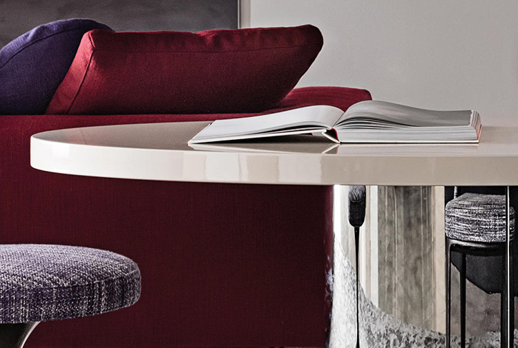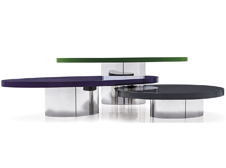 体积与造型的游戏,大胆的不对称性,一切似乎是对地心引力的挑战。这就是Raymond的美学理念。这款产品有两种高度可供选择,61厘米和74厘米。椭圆的造型是基座和台面的主题元素,基座采用镀铬金属制成,台面的亮光漆色彩缤纷:白色,Sand色,紫色,绿色和花岗石色。