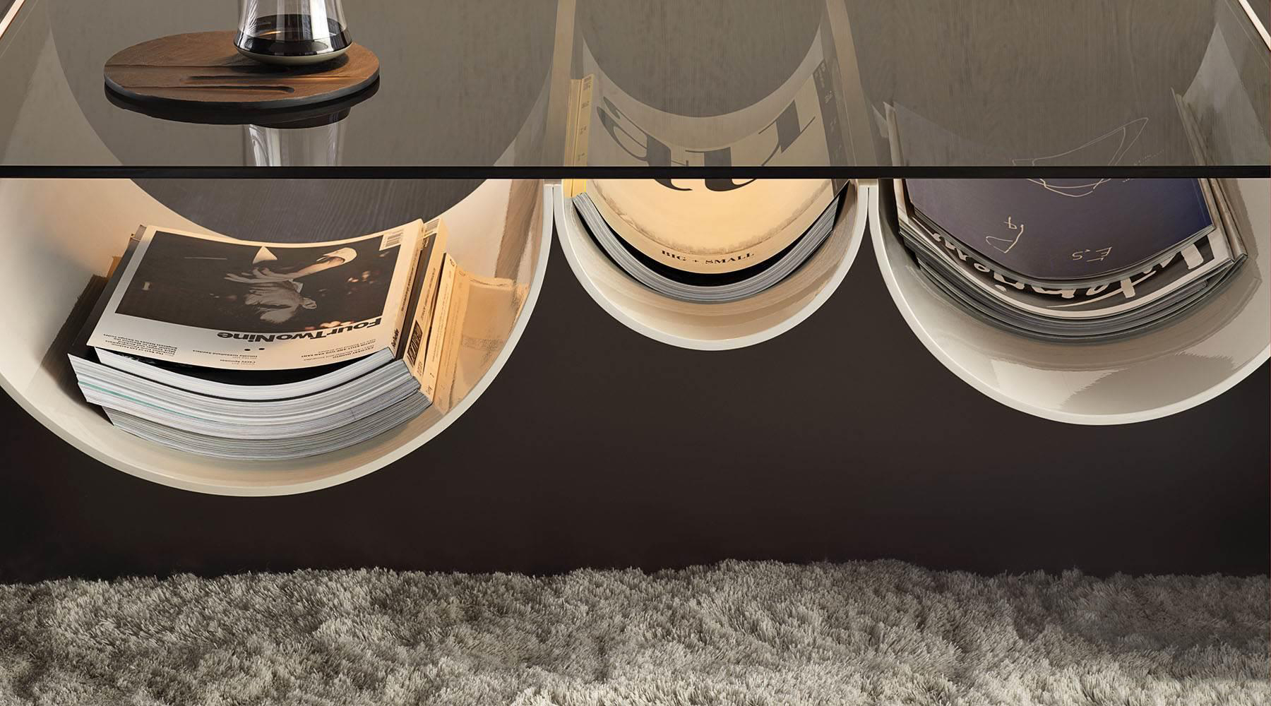 连续的连续的倒置的半圆形使前轮廓蜿蜒而上,适应了空的空间,使使用者能够将杂志、报纸和小物体以平视的方式离开。