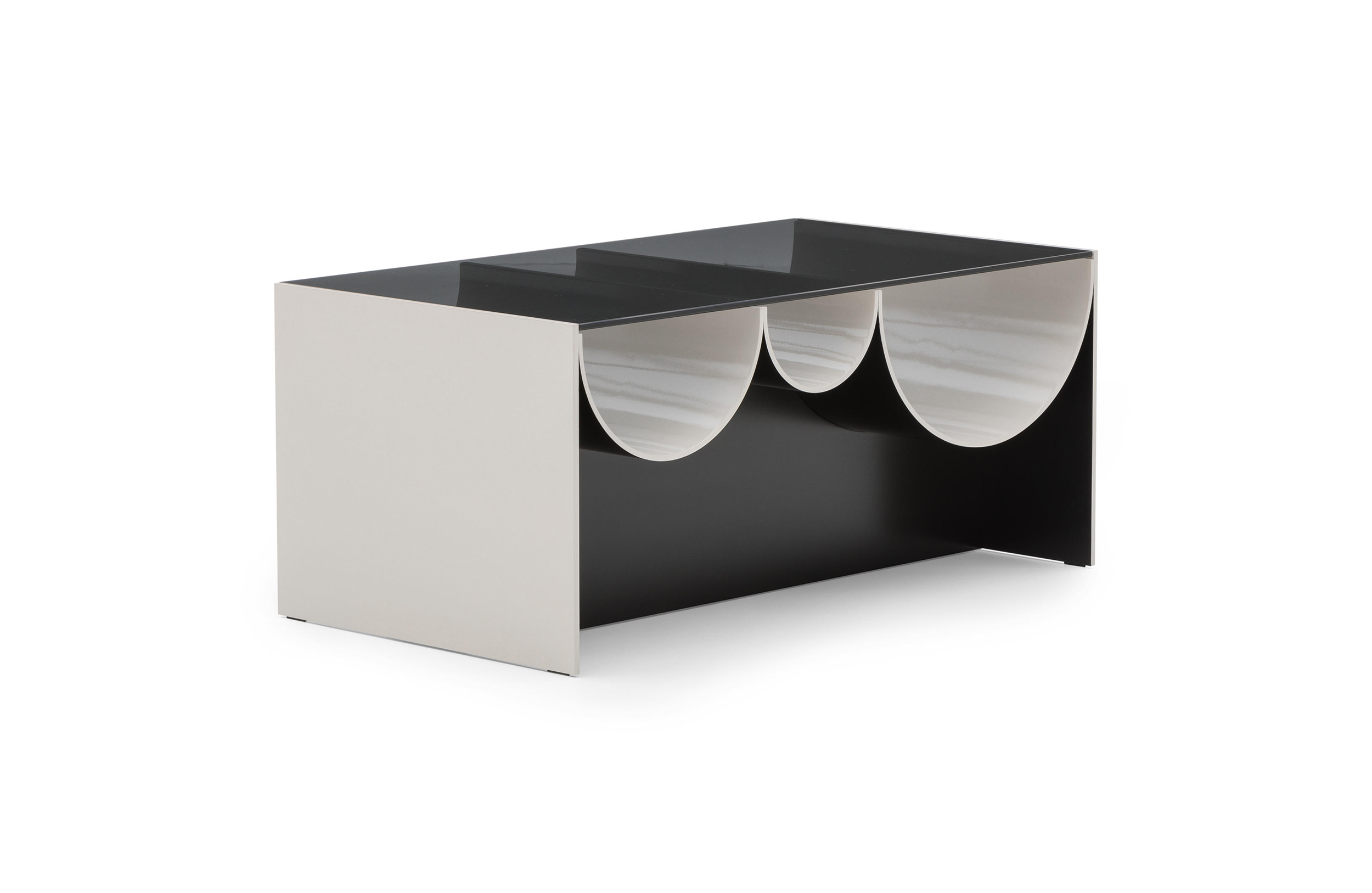 波浪咖啡桌是由一种烟熏的灰色玻璃制成的,它由一种漆成的铝结构支撑着,外面是一种沙子或浅青铜色的色调,里面有一种淡黄色的色调。