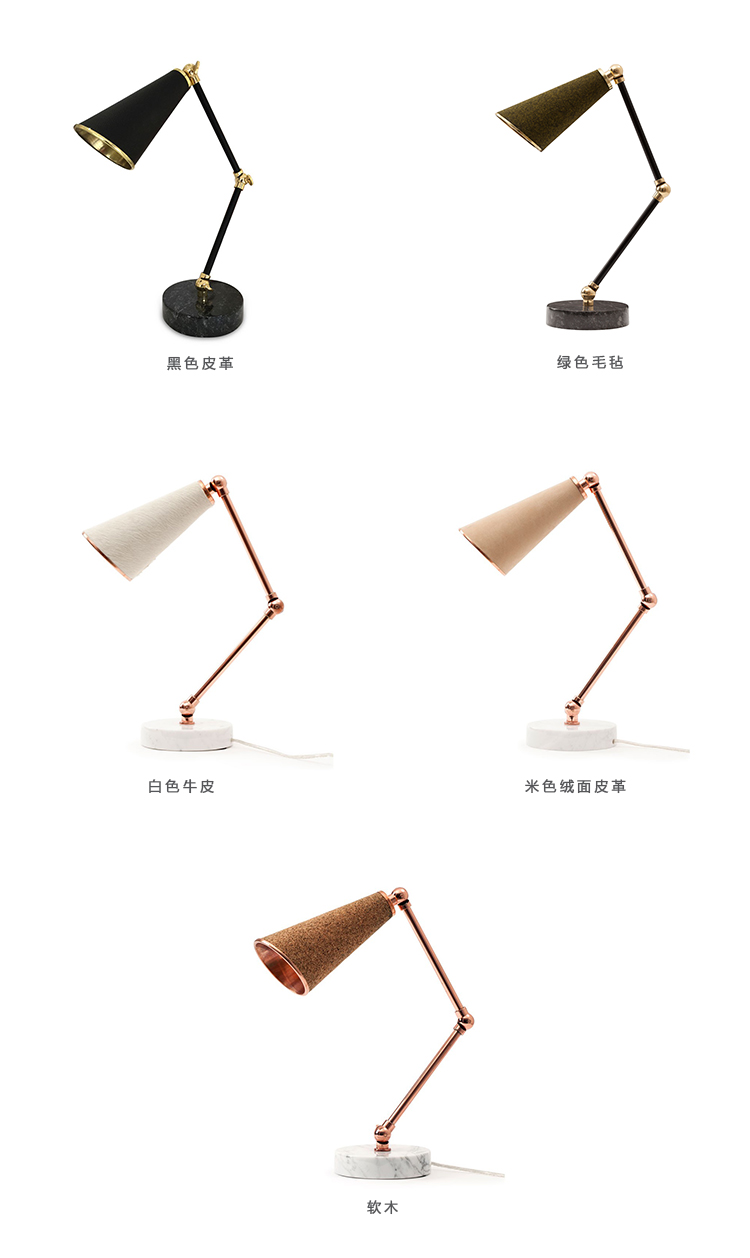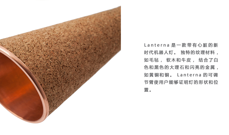Lanterna(兰特纳)是一款带有心脏的新时代机器人灯。 独特的纹理材料,如毛毡,软木和牛皮,结合了白色和黑色的大理石和闪亮的金属,如黄铜和铜。 Lanterna的可调节臂使用户能够证明灯的形状和位置。 Lanterna可用作台灯或床边照明。