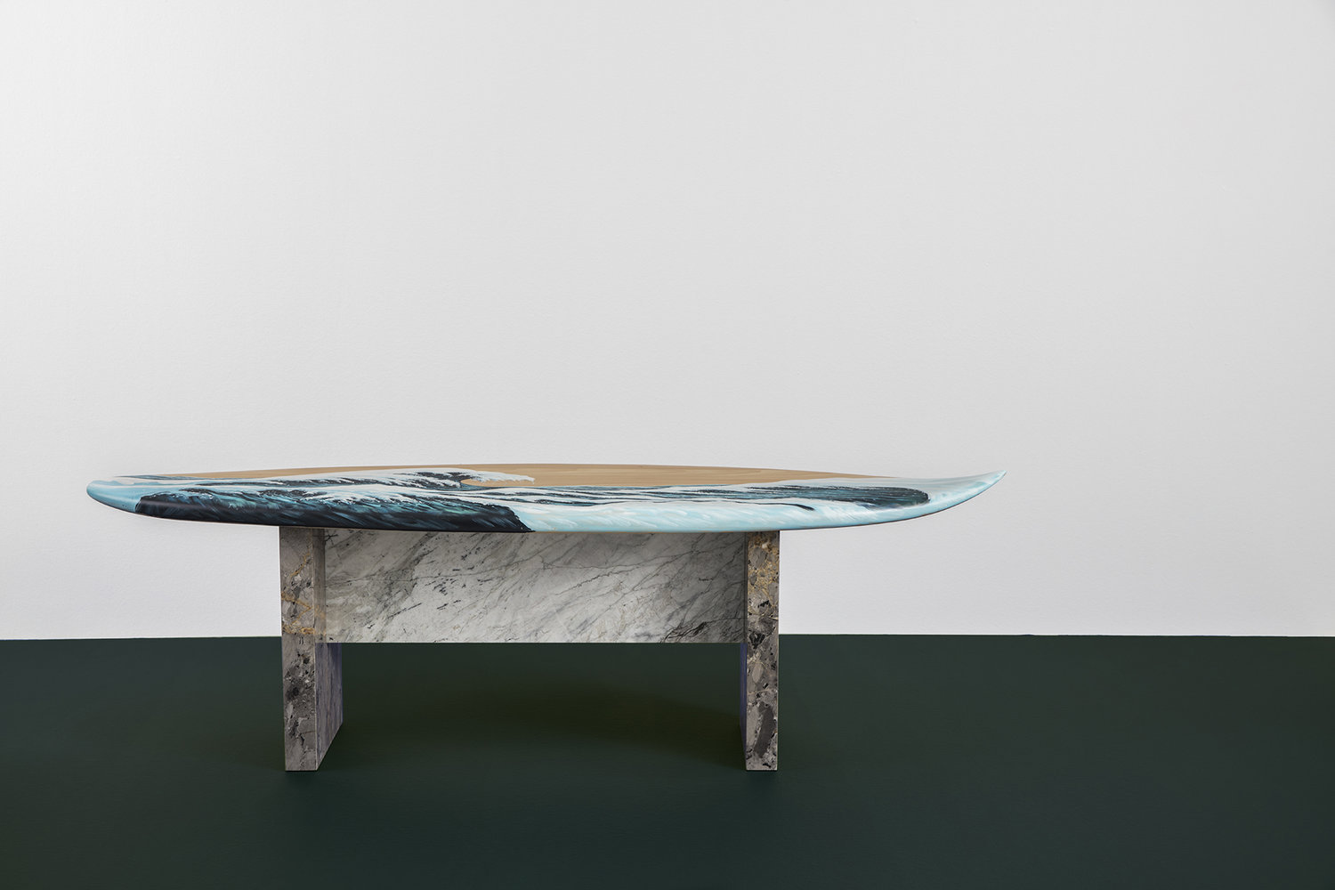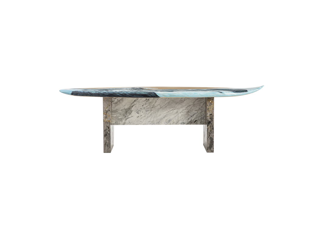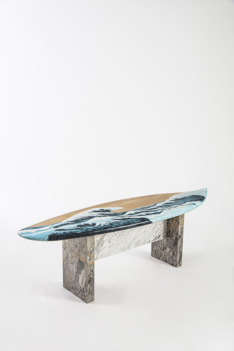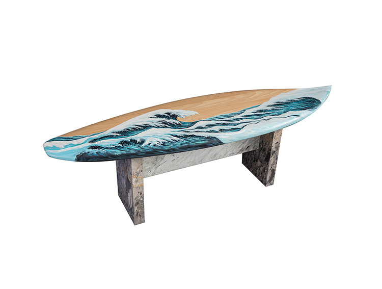 这条长凳的设计理念是:即使固定在固定的地方,也要不断移动。它结合了手工制作的石灰木和对比鲜明的大理石腿。座位是手绘的,让人想起神奈川的巨浪。