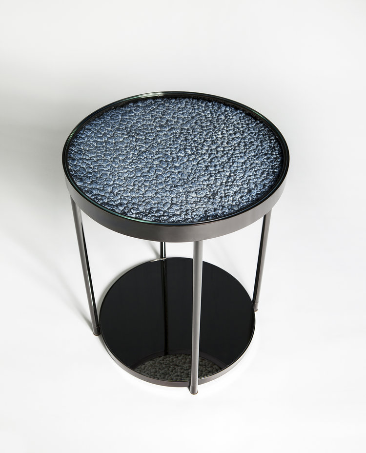 这款Hemlock设计的第二个版本具有更加男性化的感觉,抛光的黑色镍面和深色的镜面玻璃底。 月球状聚氨酯顶部采用靛蓝色调手工喷涂,以突出深度变化。原始白色顶部的照片固定在桌面的下侧,并在底座的镜子中反射。 这造成了同时看到白天和黑夜的错觉。