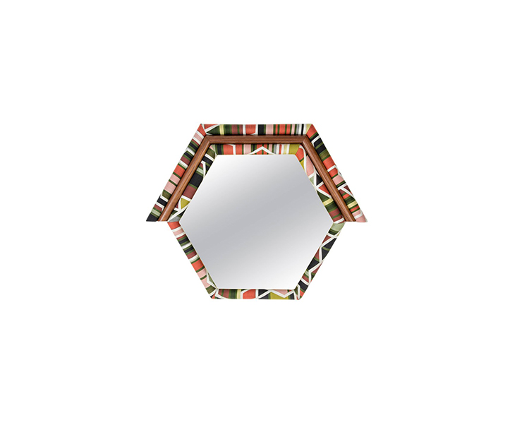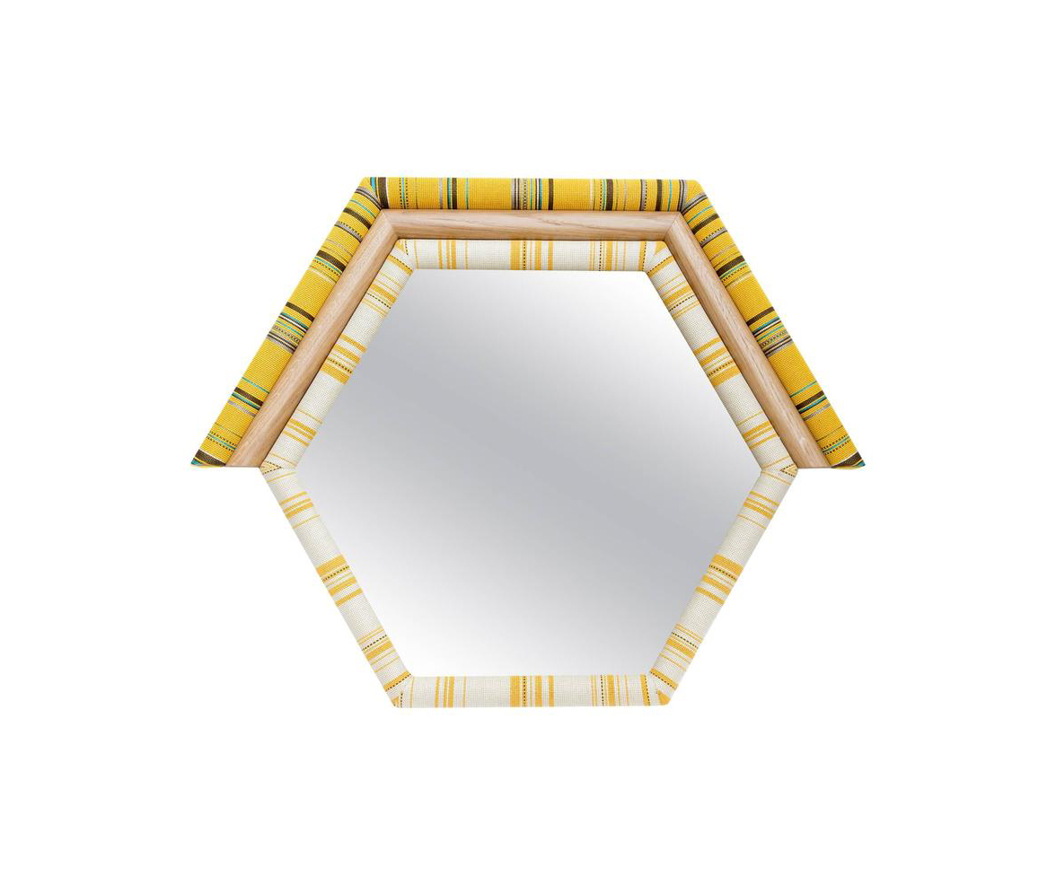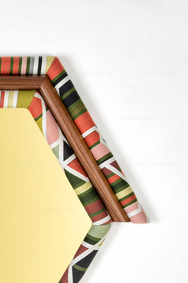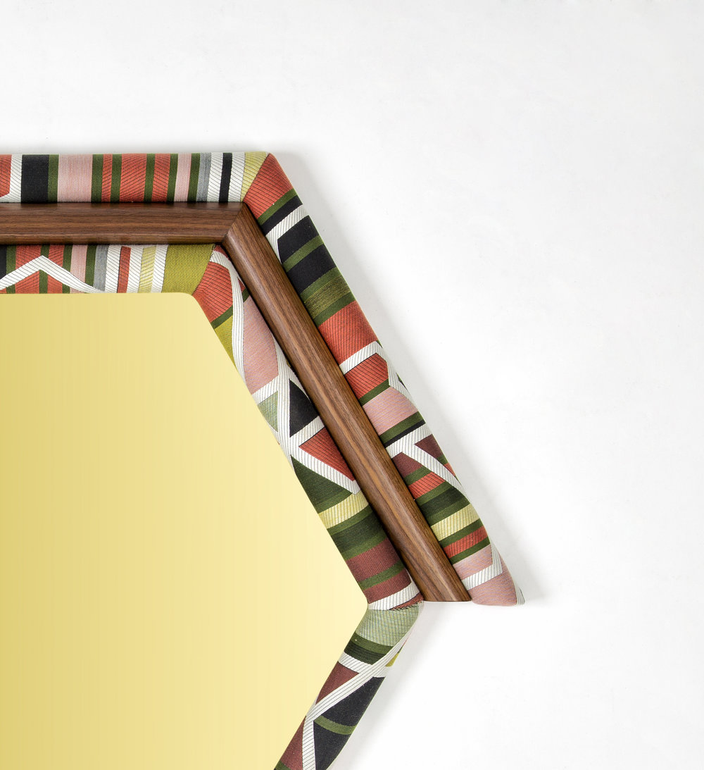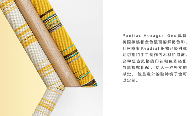 Pontiac Hexagon(庞蒂亚克六边形镜)具有美国核桃和金色镜面的鲜艳色彩。几何图案KvADRAT织物已经对称地切割和手工制作的木材和泡沫。这种复古风格的印花和色彩搭配与黑核桃相配,给人一种朴实的感觉。这些意外的独特镜子也可以定制。