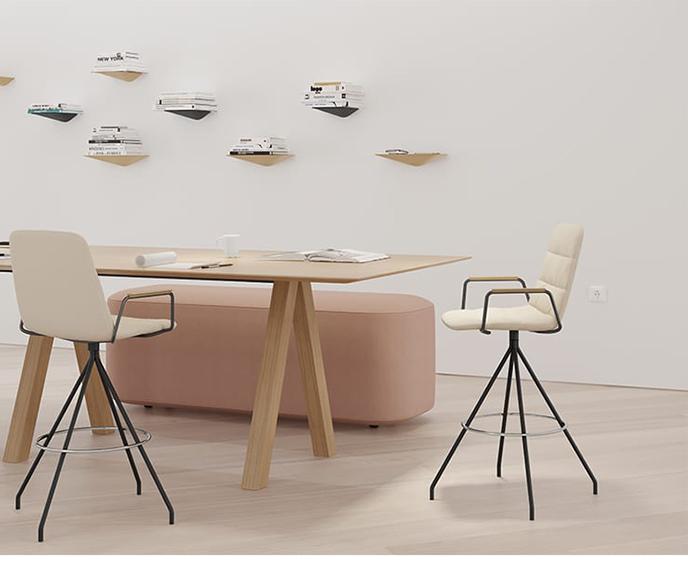 胶合板橡木凳子,饰有各种饰面。座椅可以是木质的,带软垫的垫子或完全软垫的光滑或条纹版本。适合家庭和合同使用。它的名字是对它后面的插槽的引用,它既可以作为轻松移动它的手柄,也可以作为悬挂手提包等的支撑。也有武器。