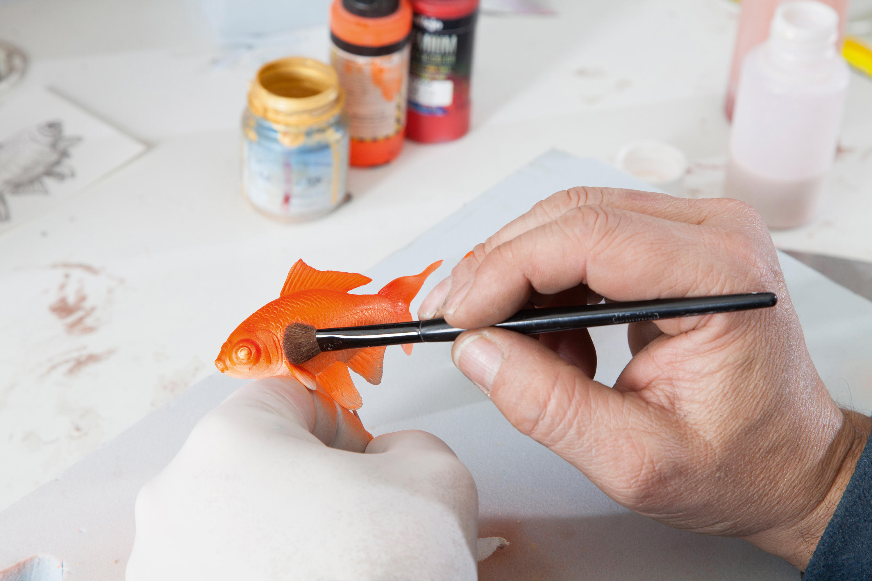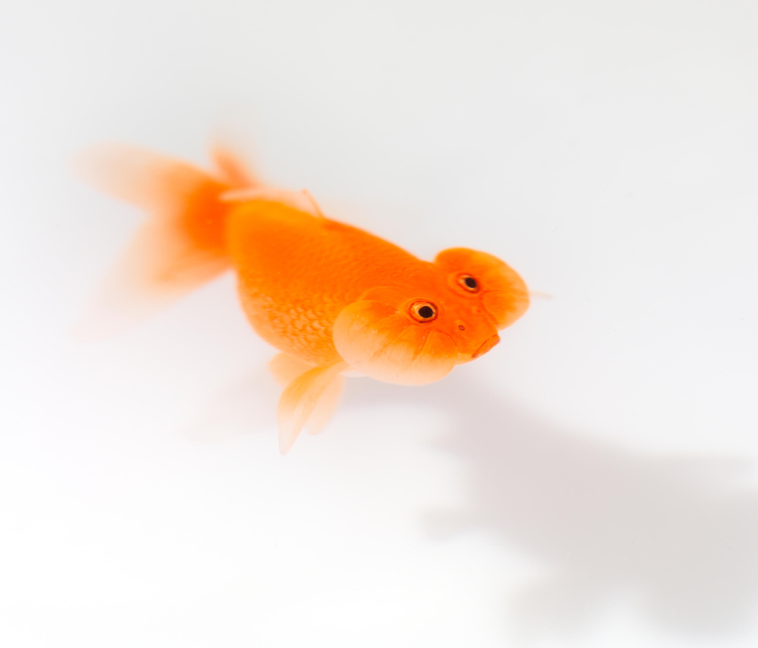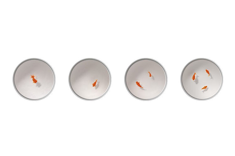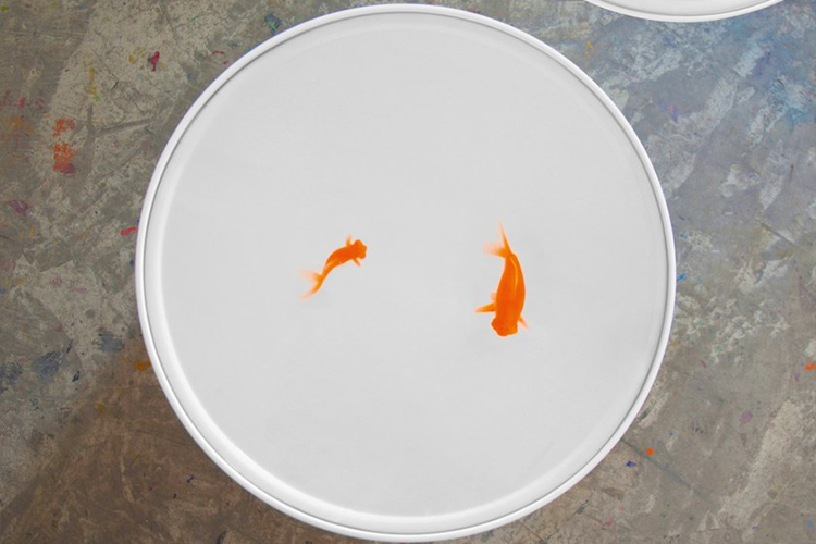 奇异空间的微妙选择,鱼漂浮在漆成的圆柱体中,除了自身外没有其他装饰。