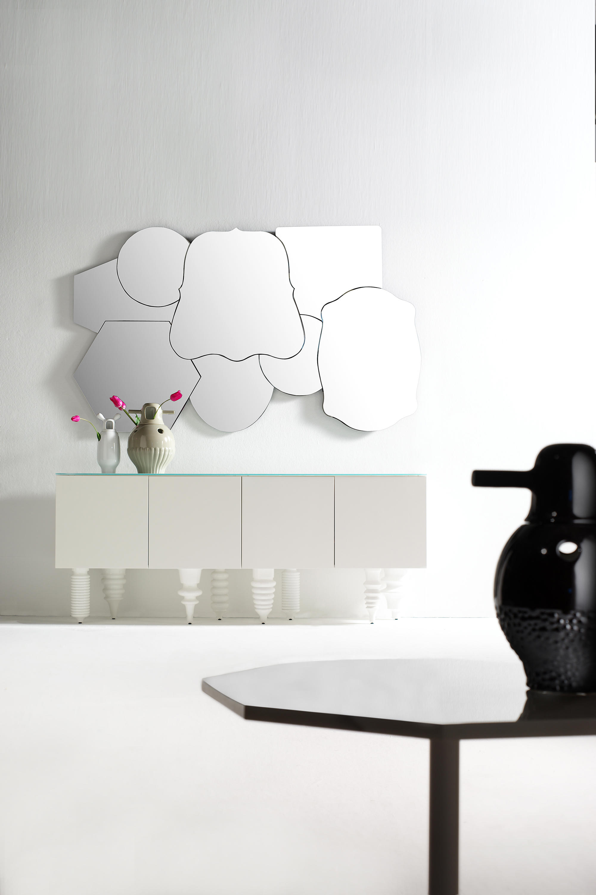 八个镜面的组装在一起,形状和样式互不相同。它们可以安装在一起或分开安装。后部为哑光黑色漆面漆。每个单元的独立固定硬件为镀锌白钢板。有些型号可能需要单独提供。Jaime Hayon是西班牙新设计中最迷人的人物。他具有活力,才华和自己的风格,这些都被融入到Showtime中。他曾为西班牙最负盛名的西班牙设计公司Bd Barcelona设计而设计的系列。年轻设计师与资深生产商之间的这种快乐相遇导致了家具系列的诞生,该系列既适合家庭使用,又具有适应性和个性家具装饰,塑料漆面和微妙的陶瓷传统相得益彰。在古典与现代之间的这些对比中,Showtime反映了Bd一直以来的精髓。