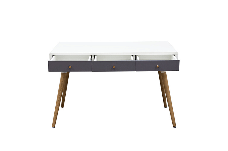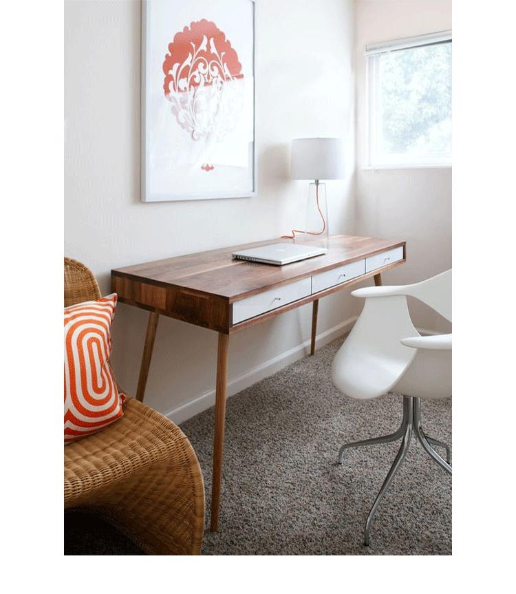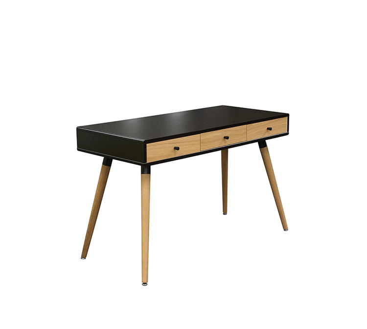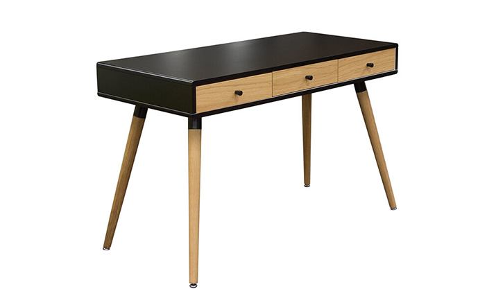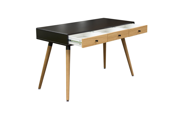 diamond sofa sonic writing desk(钻石沙发声波写字台)本世纪中叶复古声波3抽屉桌,为你家居的装修提供了时尚工作空间。起有着黑色橱柜和橡木抽屉前挡板,酷音效果时尚突出了固体橡树喇叭的腿设计,适用于家庭和工作办公。制作采用精选MDF板基材、进口胡桃或樱桃木皮贴面、实木脚架、彩色装饰边、环保净味油漆喷涂、做工精湛。