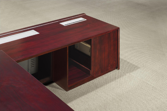 全用酸枝木NO-5349色,主桌与侧柜交错衔接配有智能抽、