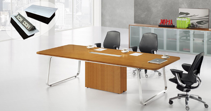 ※ 上图为同系列配套会议桌:此款会议可以选择手动线盒、电动线盒、以及毛刷翻盖线盒,适合你不同的办公需要,内部可配置动功能三插电源孔、网络接口、耳机音频接口、话筒接口、VGA接口。