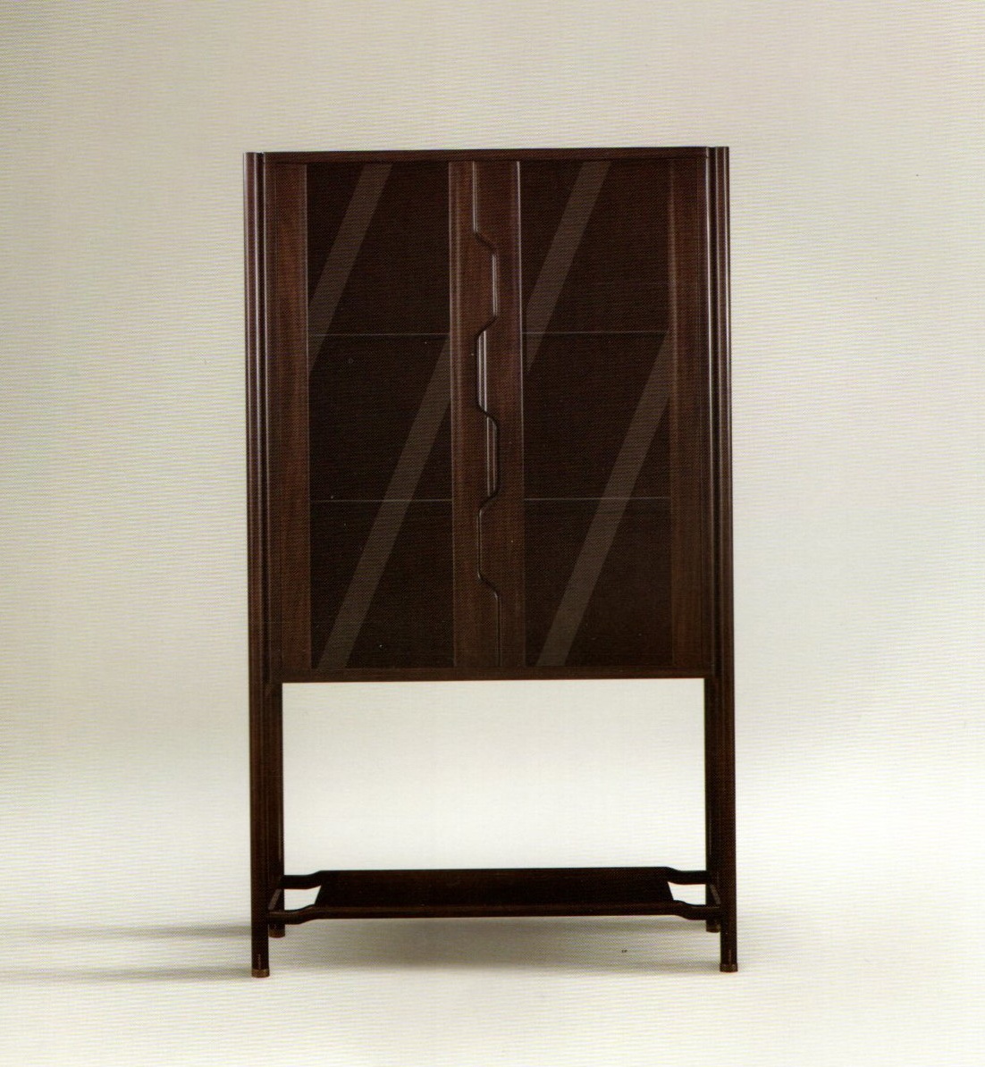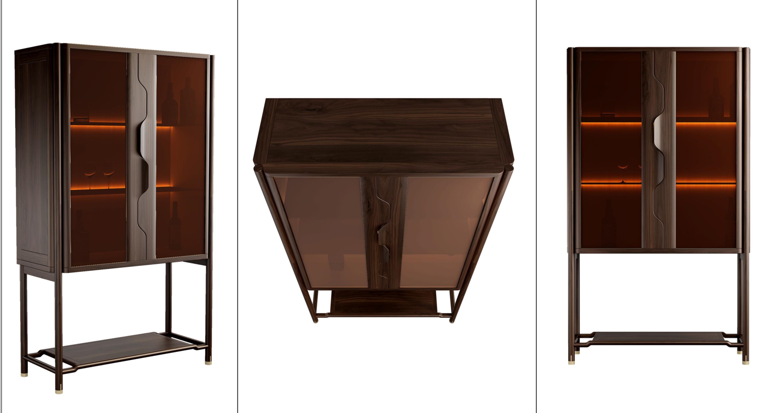 1.整体造型源于明式柜类家具形制,简洁干练,通透感强。 2.柜体内置LED灯,增强实用性。 3.柜门拉手创意设计为连续榫卯造型,致敬经典,同时握感舒适。 4.铜脚设计,赋予中式韵味的同时以防磨损。