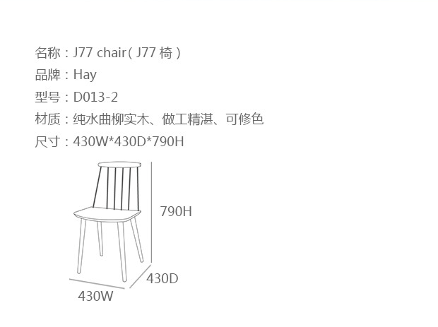 J77是由Poul M.Volther在50代所设计的三脚单椅,使用山毛榉原木制造,另有四种不同色彩黑、灰、白、珊瑚红可供选择。隶属于FDB系列的J77单椅,是HAY在 2011年推出丹麦精典家具复刻版系列之一,当年原本是为丹麦消费者合作社(FDB)所设计的产品。兼具实用和自由设计的概念,就是40年代FDB的家具产品核心概念,藉由规模性的生产,降低成本,FDB系列让设计家具在当时的丹麦不再那么高不可攀的遥远,FDB 系列不但价格亲民,同时兼顾制造的高质量,风味独具的设计更是历久不衰。经典的温莎式造型 (Windsor style),可以说是FDB系列单椅 - J77/J104/J107/J110共同的设计DNA,全木制的FDB系列单椅,椅背由多根直棂构成,通透利落的造型,带出有别于其他单椅的强烈视觉效果,通透的靠背设计,也让整体造型变得轻盈,但底部三只旋木椅脚由上至下向外倾斜挺立,具有轻巧而稳重的视觉效果。J77是FDB系列当中,唯一的一张三角单椅,并且有着造型别树一帜的三角椅面,体积较小却又舒适无比的J77不但适合商业空间或较小的居家空间使用,也适合与其他FDB系列单椅相互混搭,营造高低的层次效果。数十年过后,HAY决定重新生产的FDB系列,除了立基于HAY的品牌精神-期许让丹麦家具设计回归50、60年代的创新思考模式,并赋予崭新的当代内涵。也将FDB系列的经典延续,并且推广至全世界,让世人都能回顾,并且享受型能兼具的FDB。