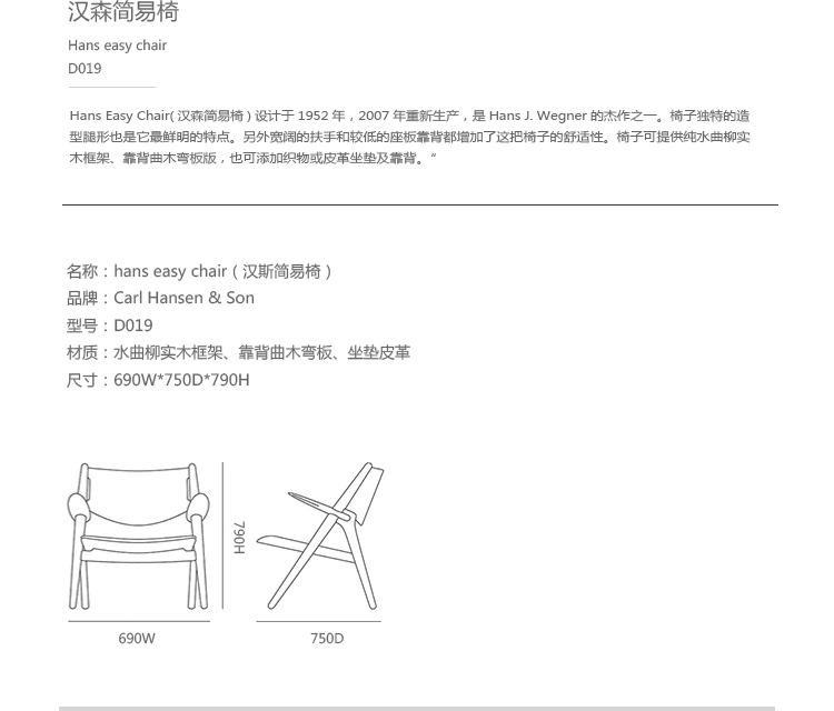 "Hans Easy Chair(汉斯简易椅)设计于1952年,2007年重新生产,是Hans J. Wegner的杰作之一。椅子的独特的造型腿形也是它最鲜明的特点。另外宽阔的扶手和较低的座板靠背都增加了这把椅子的舒适性。椅子可提供纯水曲柳实木框架、靠背曲木弯板版,也可添加织物或皮革坐垫及靠背。"