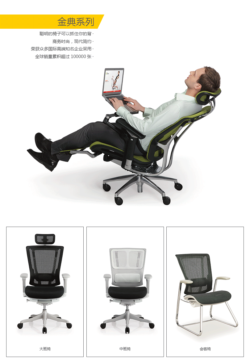 金典系列产品灵活度高,外观设计时尚,通过单杆操控多功能调整系统,使操控简便更人性化。优良的设计及精湛的力学与工学设计概念与一身,金典系列产品设计居于办公座椅行业前列,智慧移动腰背支撑系统,你怎么动他就怎么动。
