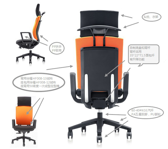 B:座背用50密度一次成型定型棉,带头枕、衣架、带发泡PP扶手,PP胶壳,用60-