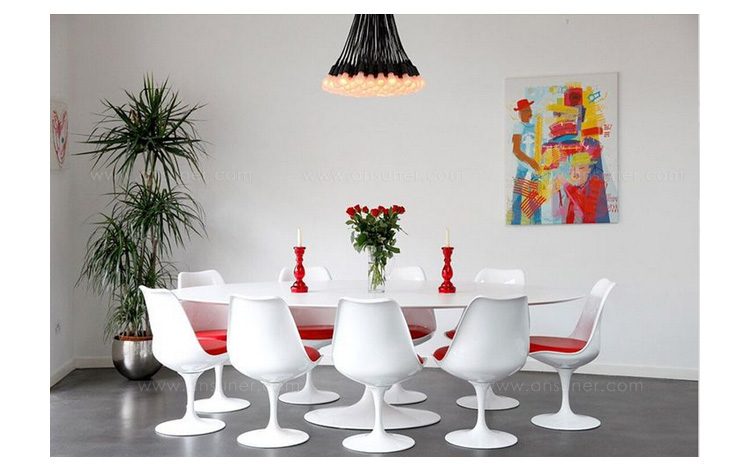 Tulip Dining Table(郁金香餐桌)是芬兰裔美国设计师Eero Saarinen在1956年设计的作品。优雅、清秀的桌脚配上天然的大理石桌面,极简却又完美。Tulip Dining Table(郁金香餐桌)是现代餐桌的代表作,作为家庭中使用餐桌、高档饭店中的餐桌和酒店中使用的餐桌都非常合适。作为著名家具设计师设计的作品设计品位自然不会低,这种餐桌设计出来的时候就被广泛的运用到了饭店、酒店和家庭中,成为当时最热销的餐桌之一,餐桌主要材料是玻璃钢(可选大理石),整张桌子是采用一次成型,中途不会出现裂缝,有质量保障,桌面平滑不会凹凸。