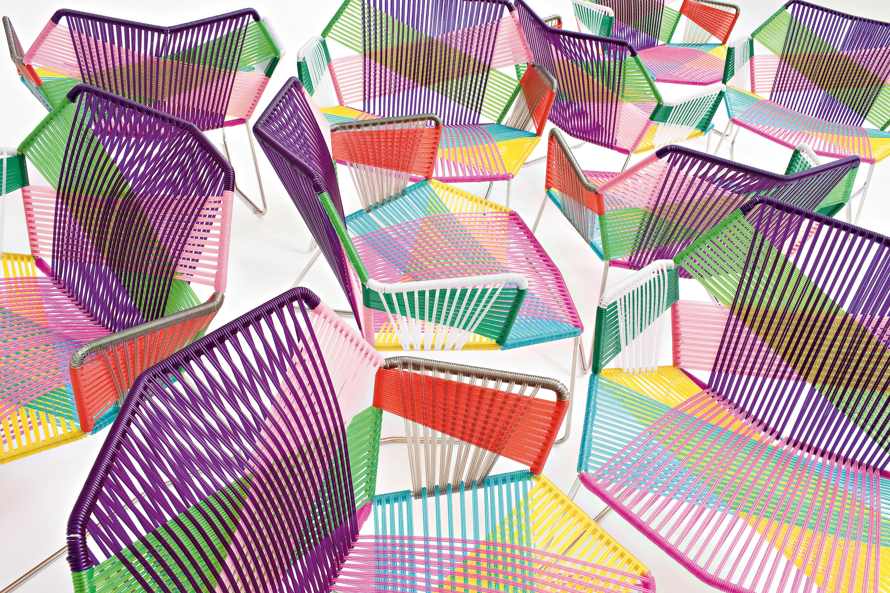 安蒂博迪(Antibodi)的钢管框架成为设计师用于创意改造的起点。框架被包裹和变换,座位根据所使用不同颜色的材料呈现不同的个性。两到三种颜色的线条以螺旋的方式将钢管包裹起来,形成了一种有趣的颜色复杂的设计。
