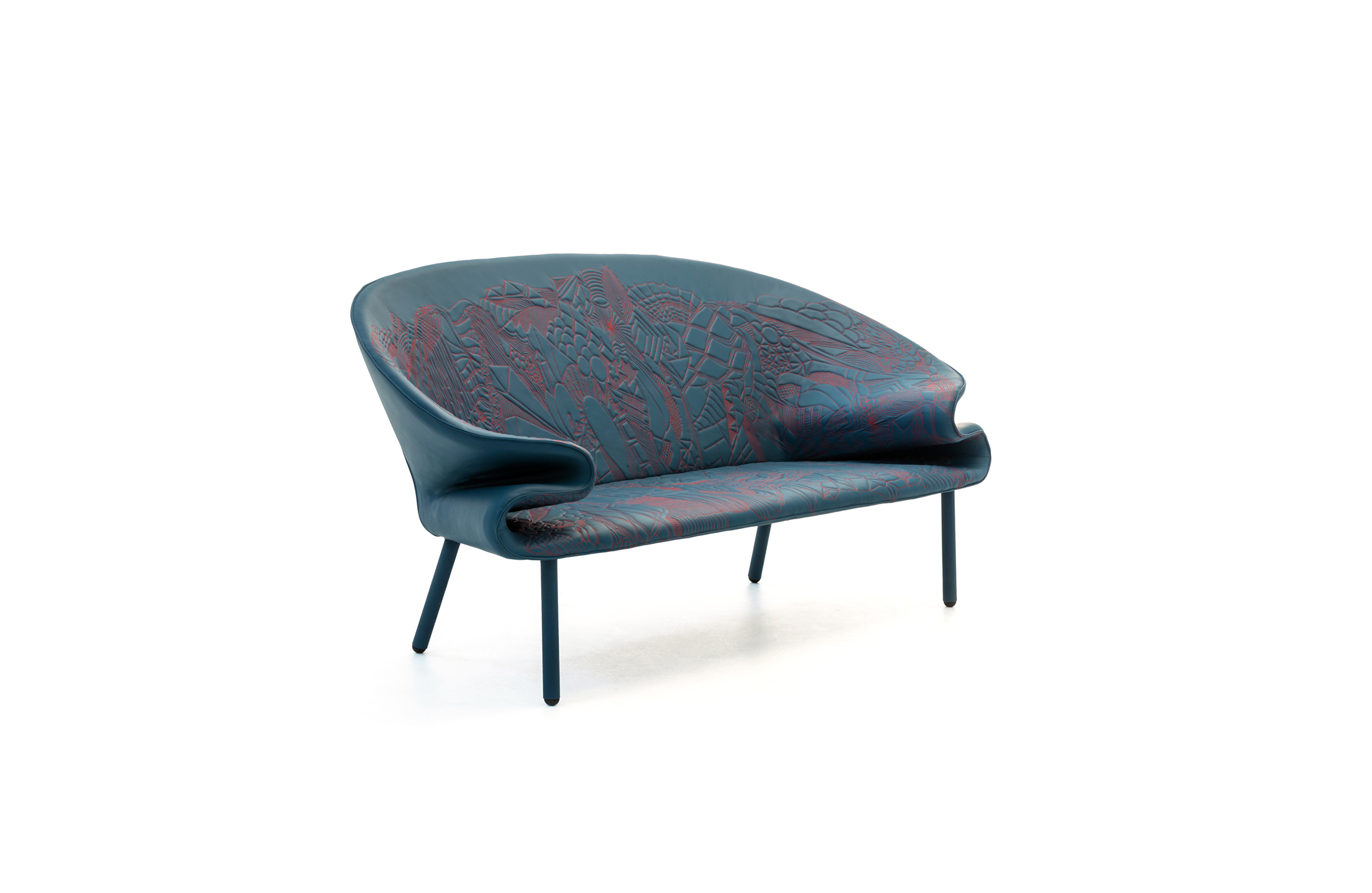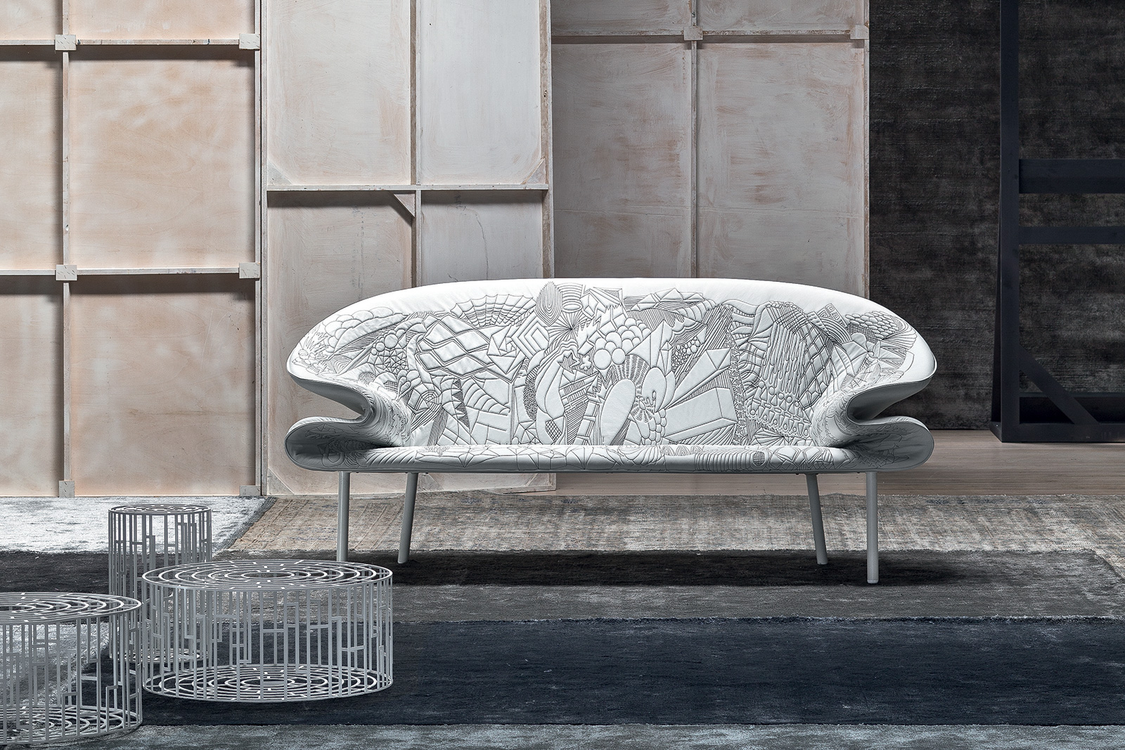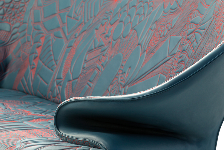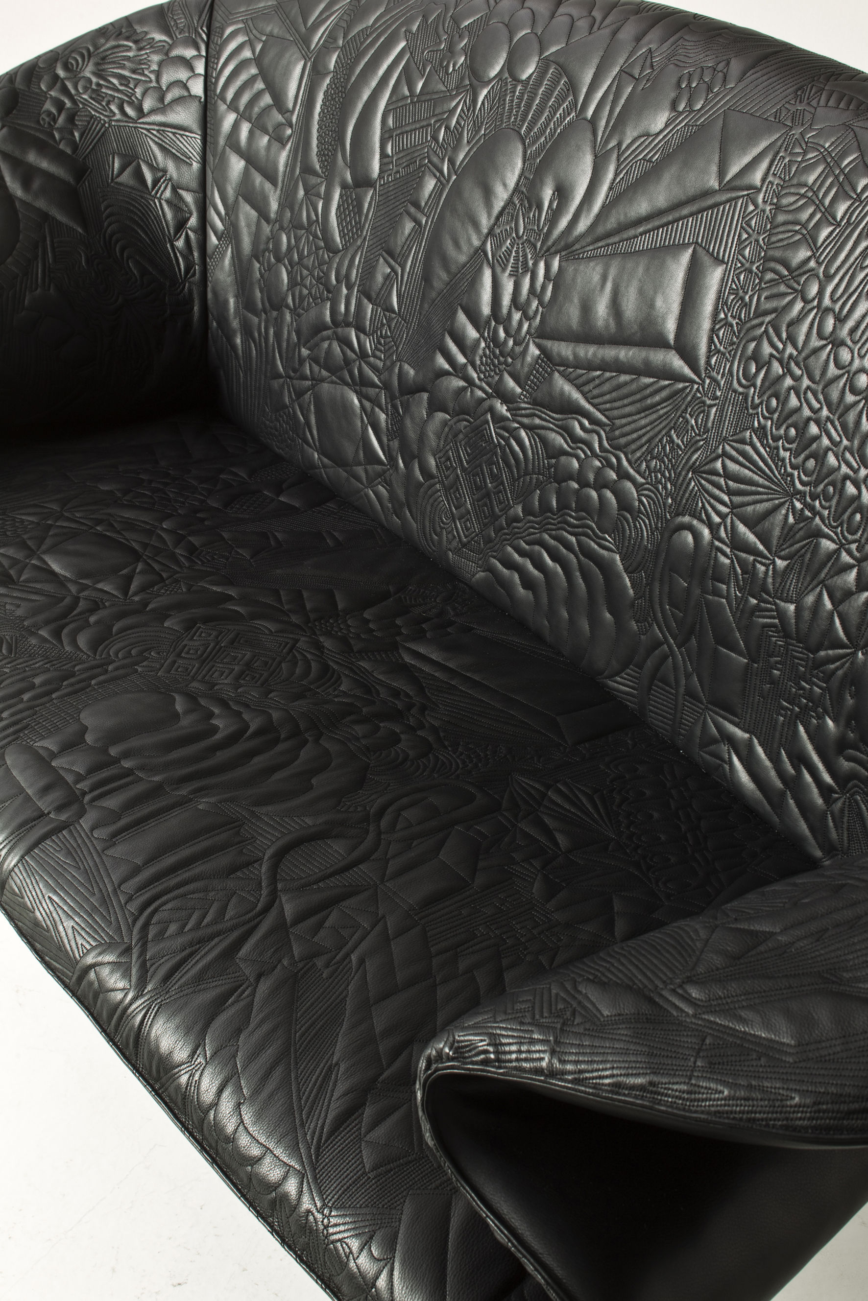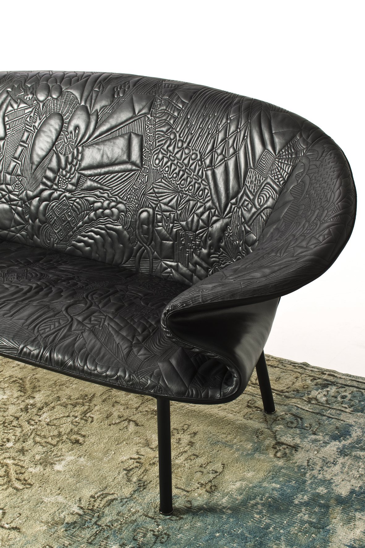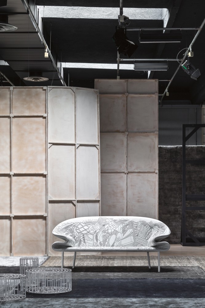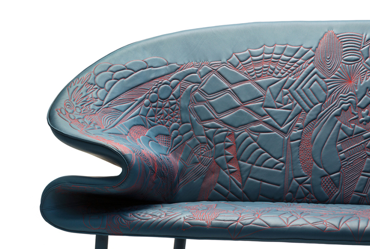 从电话通话过程中无意识地进行涂鸦的手,思想的线条浮现出来。在电话中无意识地涂鸦的那只手,思想的线条浮现出来。单纯的思考经过累加的过程,无意识的笔触,涂鸦;一开始有一条直线,最后有一个完整的,复杂的部分。因此,刺绣。沙发的设计是由折叠的毯子做成的。座椅是精致的,深沉的思想,扶手是柔软的,沙发是欢迎的。家具上的绗缝遵循着涂鸦的线条。这是一个欢迎的想法,一个白日梦。