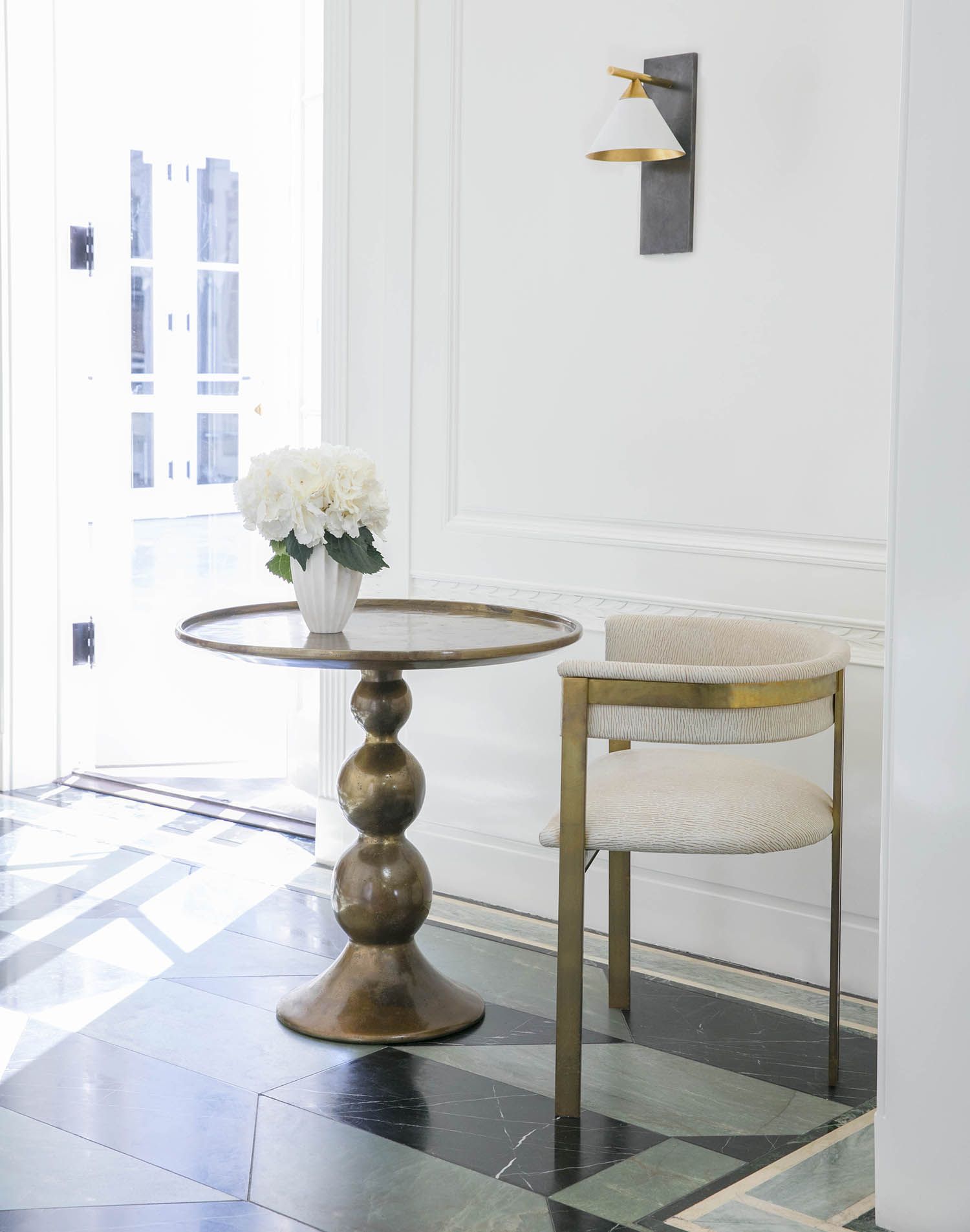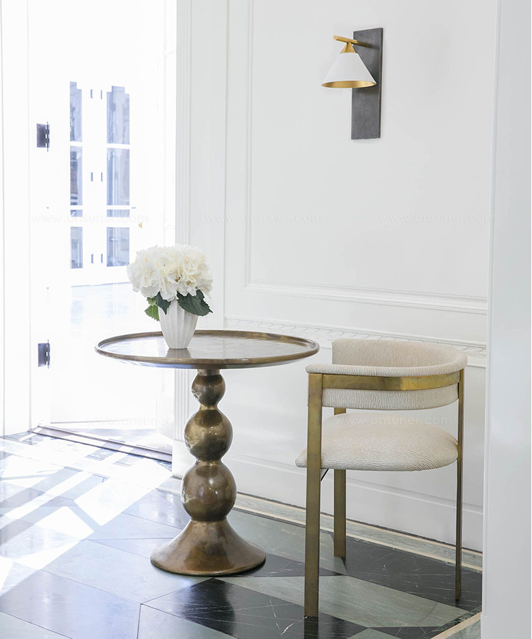 这款精致大胆的壁灯采用混合金属和几何形状进行戏剧性和建筑性设计,将有机女性曲线与时尚男性精确度并置。 其独特的声音充满了现代的精致和灵魂。 有青铜和古董抛光黄铜,古董白色灯罩和古董黑色灯罩 。