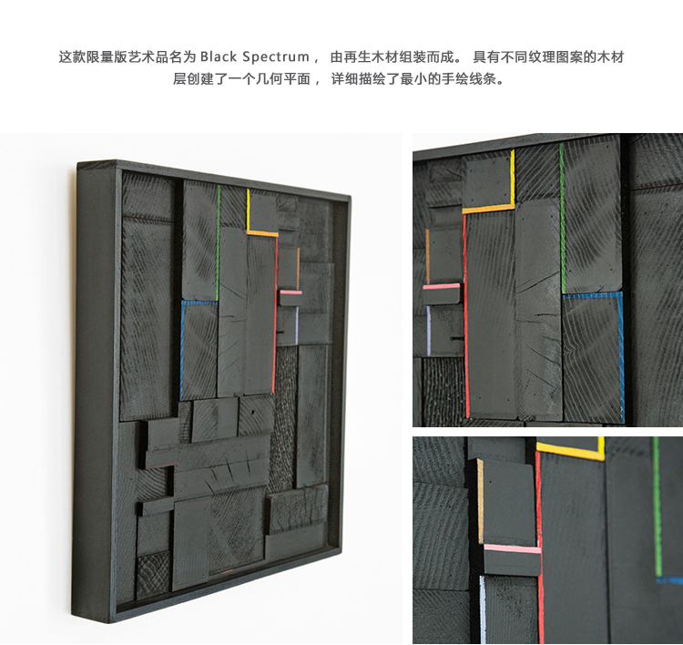这款限量版艺术品名为Black Spectrum,由再生木材组装而成。 具有不同纹理图案的木材层创建了一个几何平面,详细描绘了最小的手绘线条。