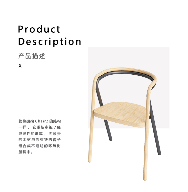 就像拥抱Chair 2的结构一样,它重新审视了经典线性的形式,将珍贵的木材与涂有铁的管子组合成不透明的环氧树脂粉末。 因此,桦木胶合板中的座椅由双管状结构支撑,该双管结构在后部动态地剪接在腿上:前部由实心灰木制成,后部由金属制成。