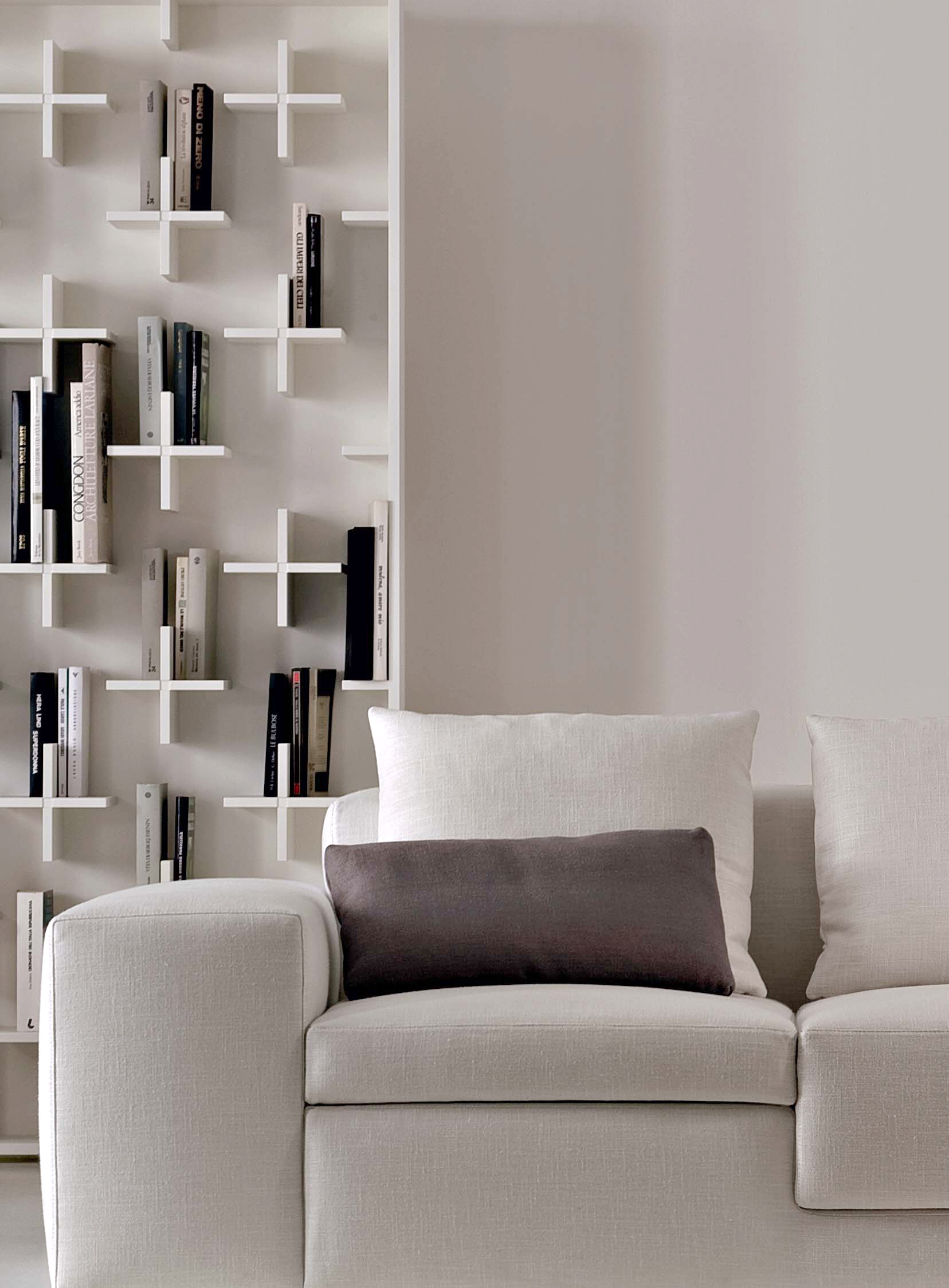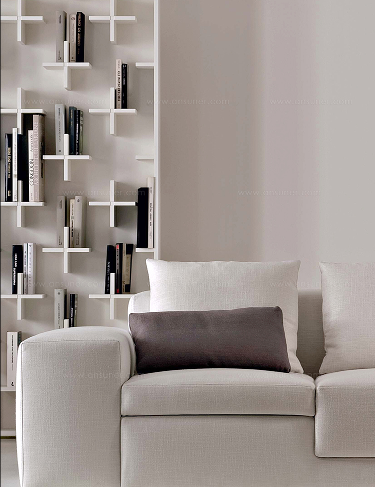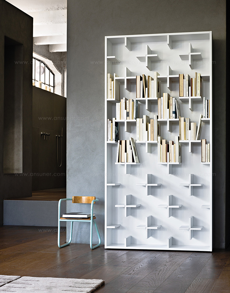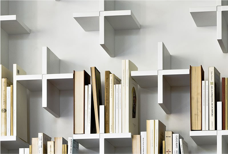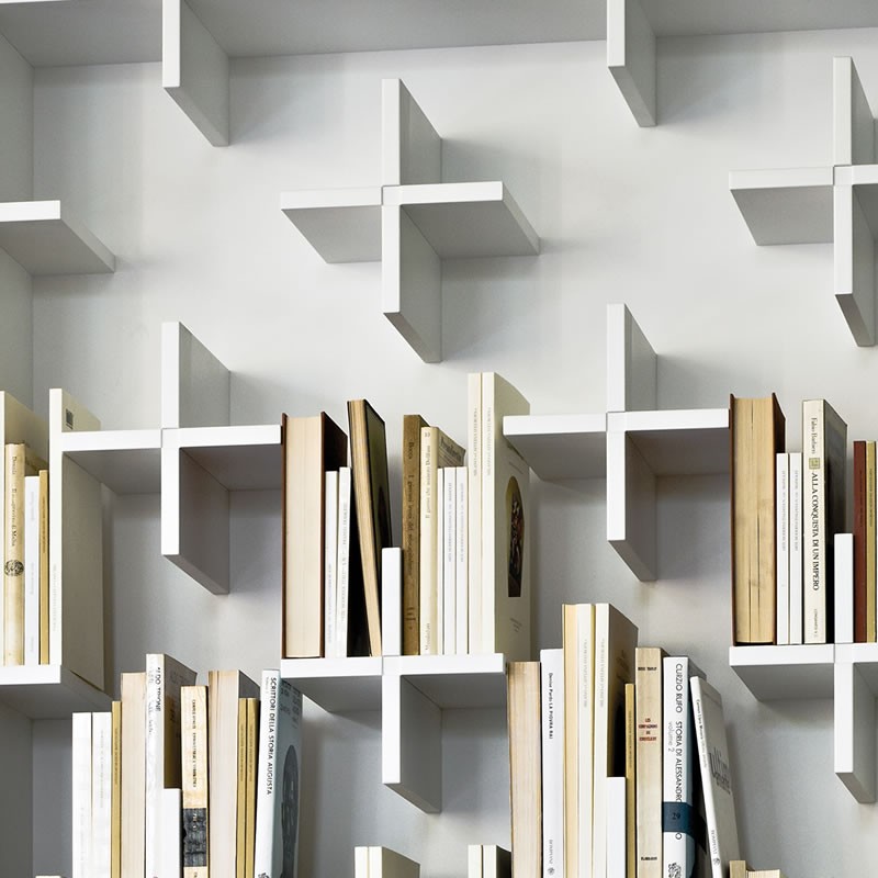 一个简单而优雅的书柜:MDF结构由很多小十字架组成,构成书的支撑。这些十字架看似杂乱无章,但当书被放置在它们上面时,它们从明显的标志变成了一个模糊而又有规律的整体。
