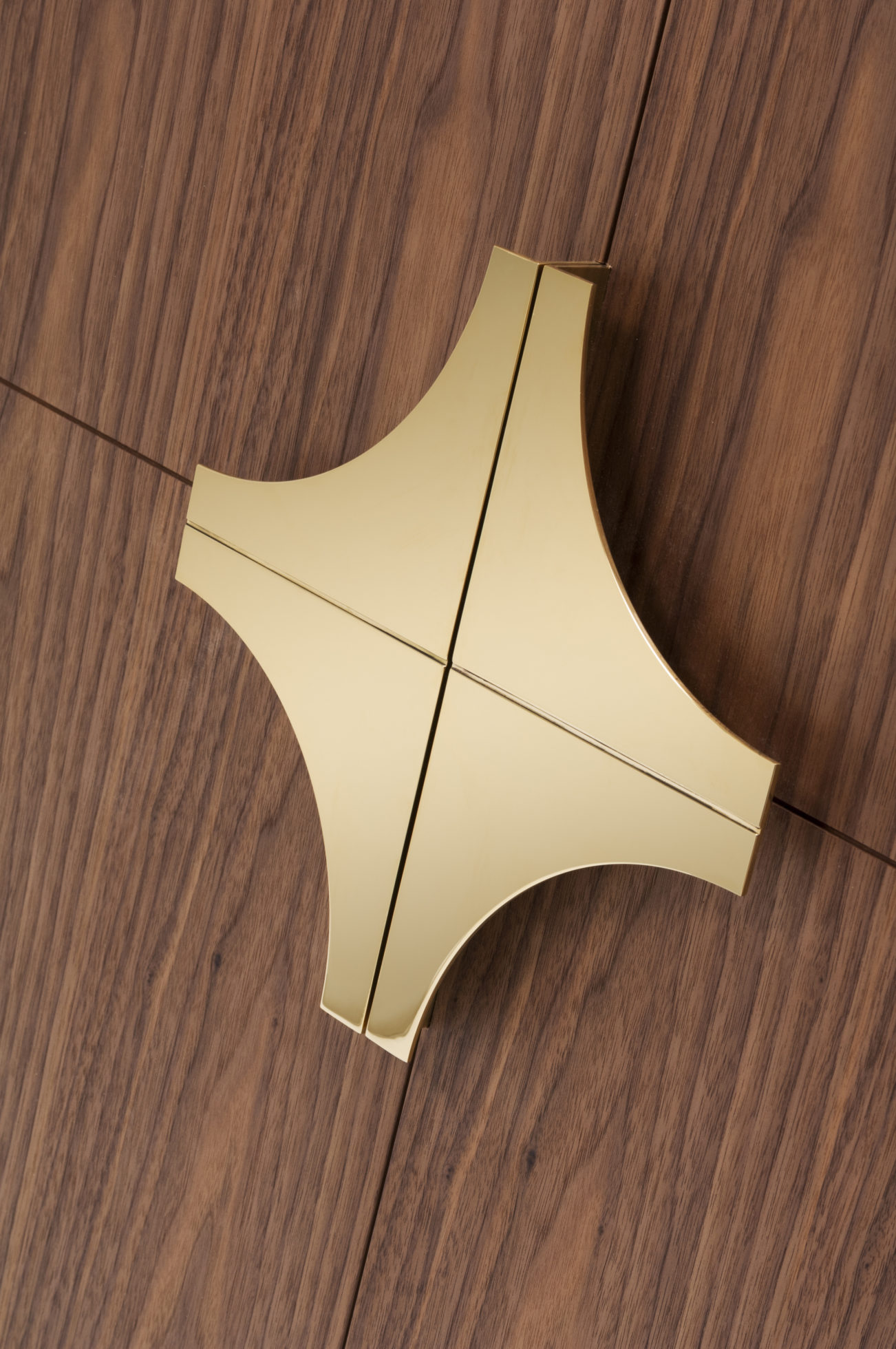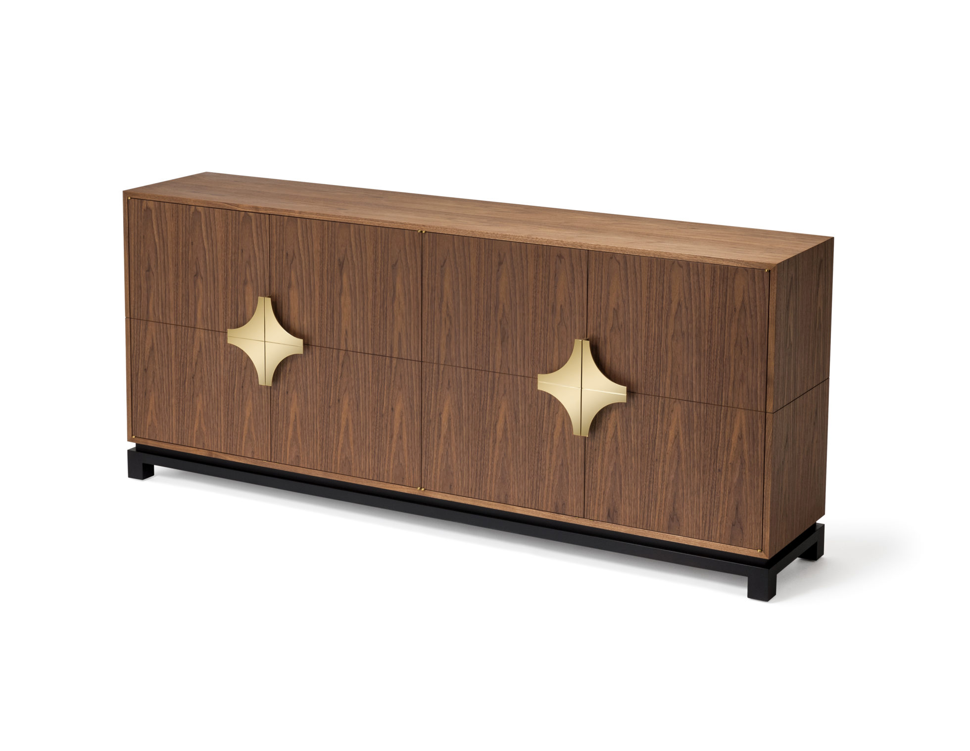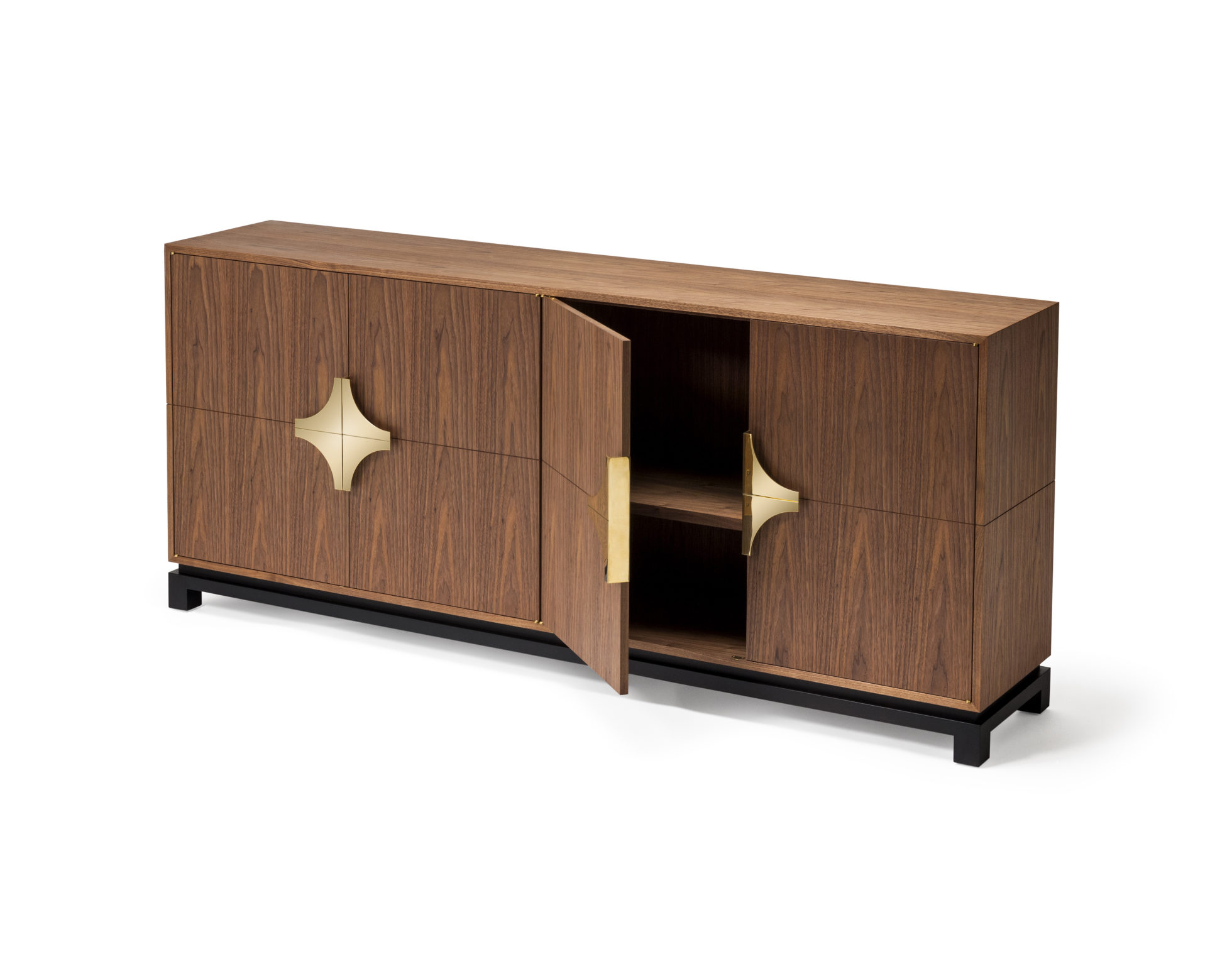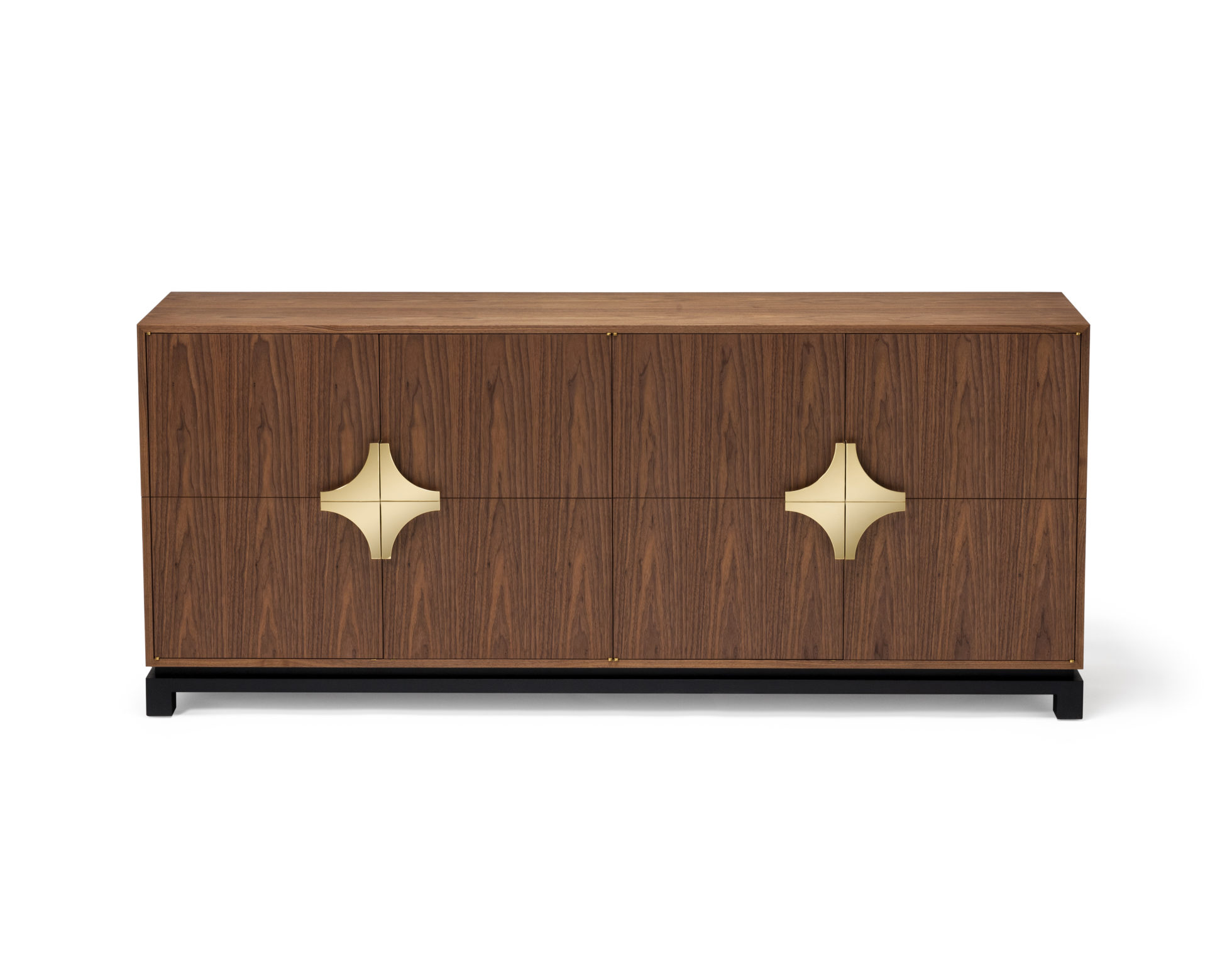 这款庄严的餐具柜配有经典的偏置枢轴铰链,子弹头和定制的黄铜手柄。