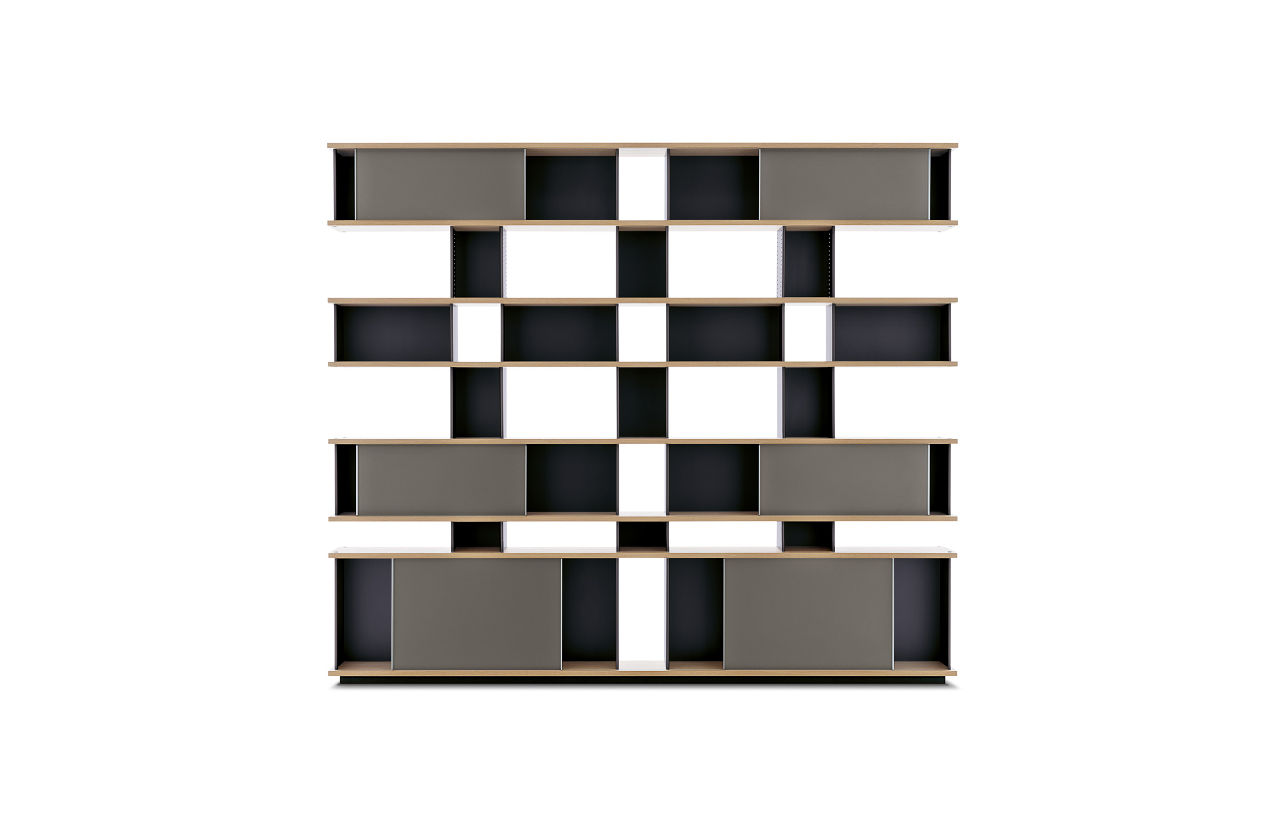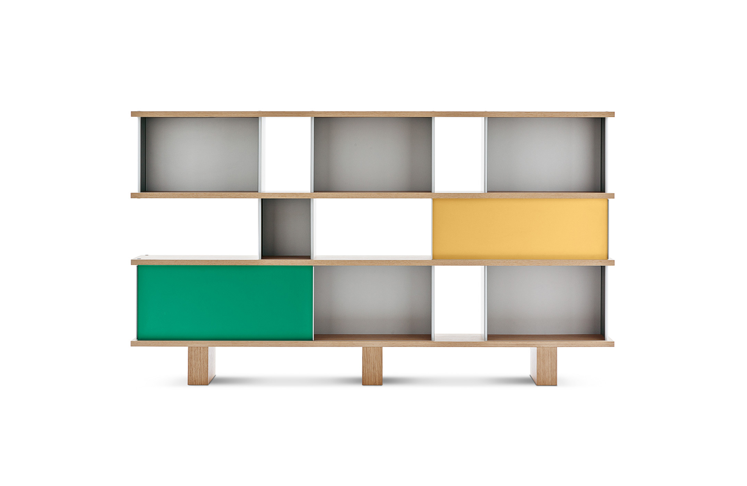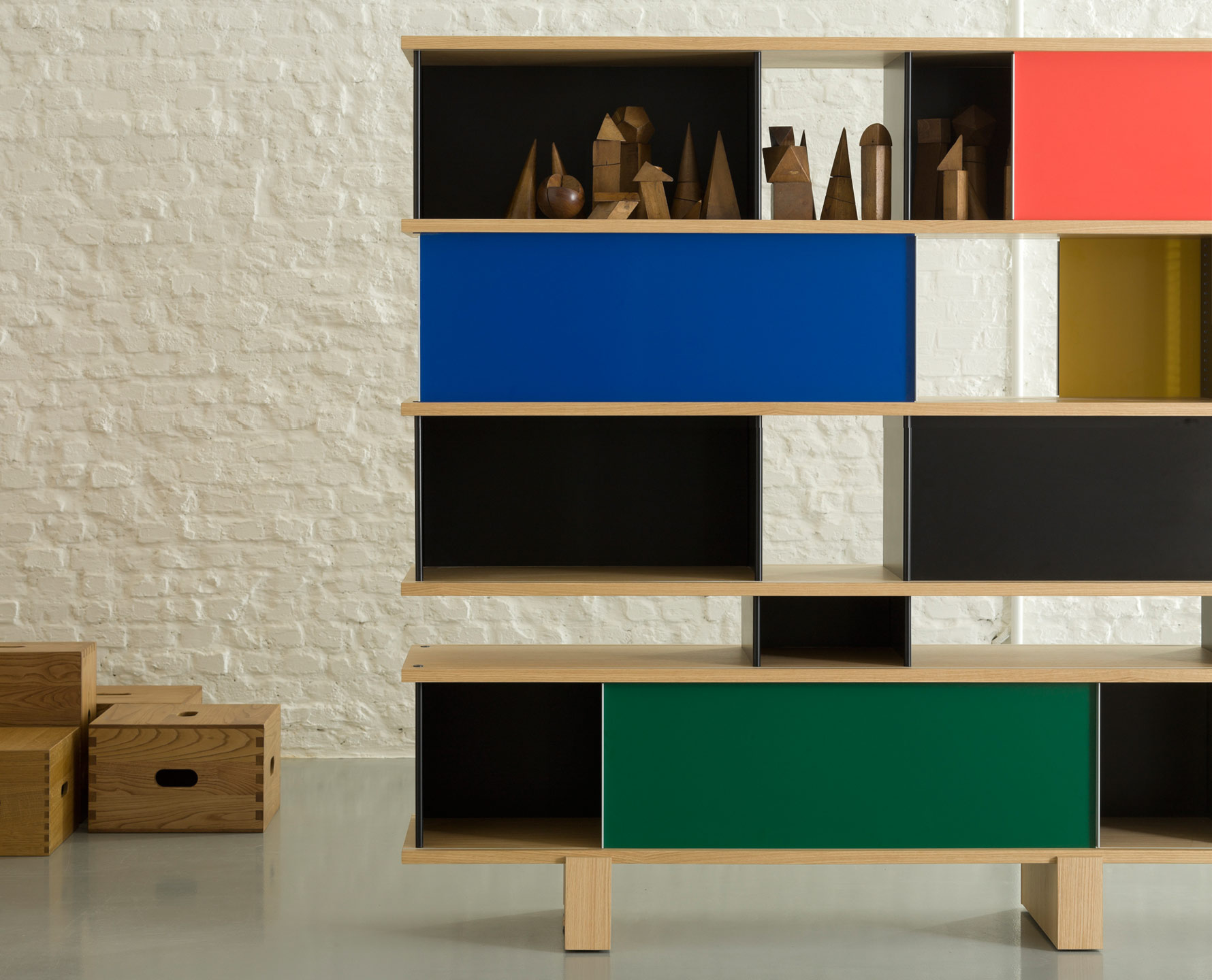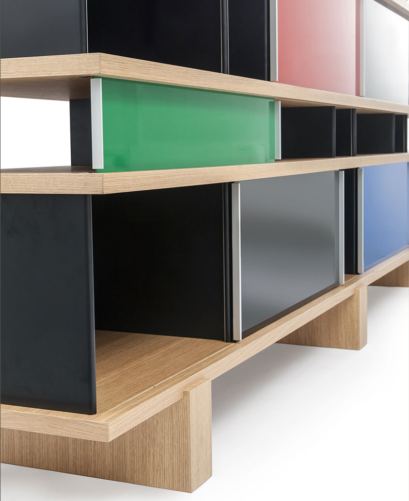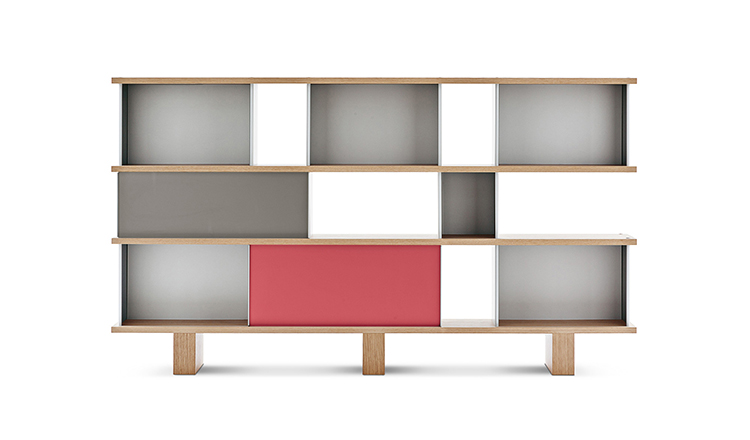 该系列包括餐边柜、碗柜和书架等,采用地面支撑或对称及非对称悬架,还包括与空间建筑风格相匹配的独立式书柜。基本单元组件为橡木搁架,阳极处理或黑色漆面的铝质单元。包括5种不同的高度,以实现物品和书籍不同风格的最佳布置。每种家具都配有附件,如铝盘等。书架滑轨采用阳极氧化铝、红色、蓝色、绿色、黄色、灰色、白色或黑色漆面。这款模块化书架由Charlotte Perriand设计,结构化处理运用巧能生精。对女设计师来说,每个模块结构并非一个单纯的块面,经过玩味地组合能有让人欣喜的效果。这件作品高度表现了Perriand在家具设计上的先锋精神,其对建筑艺术性、居住性,生活的信仰。