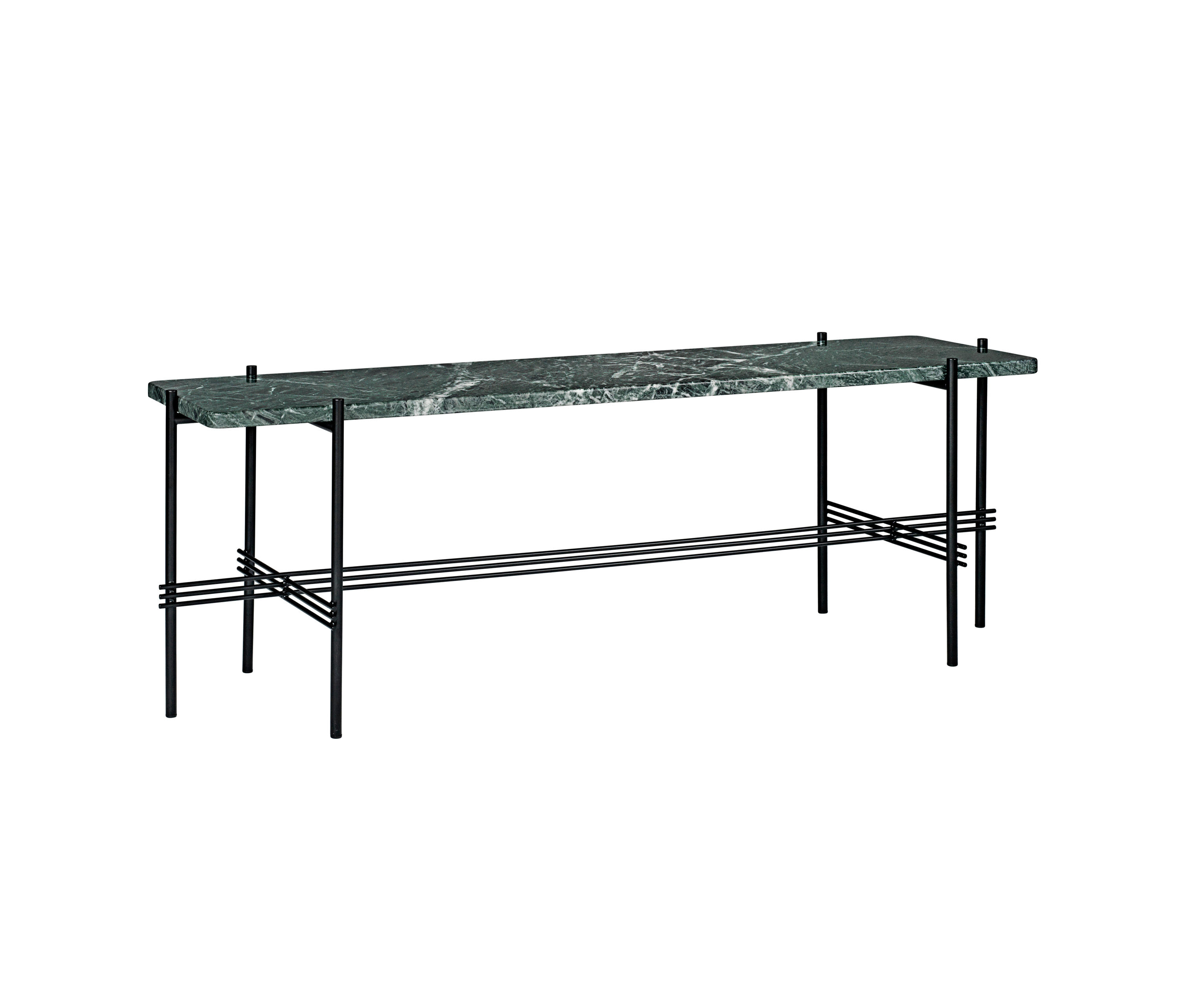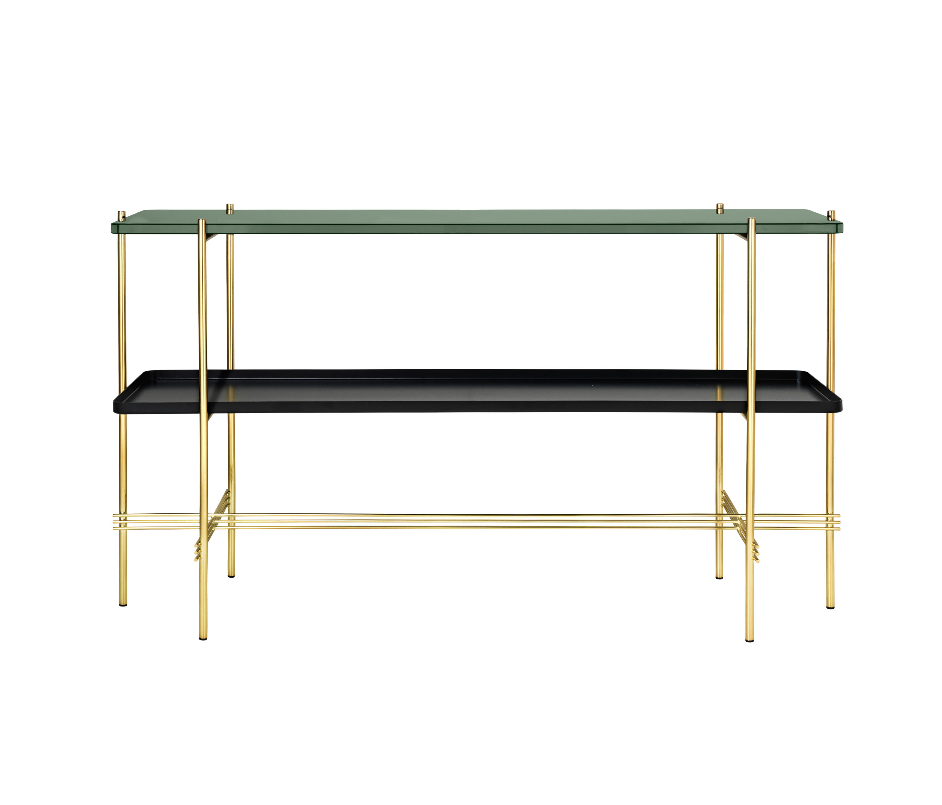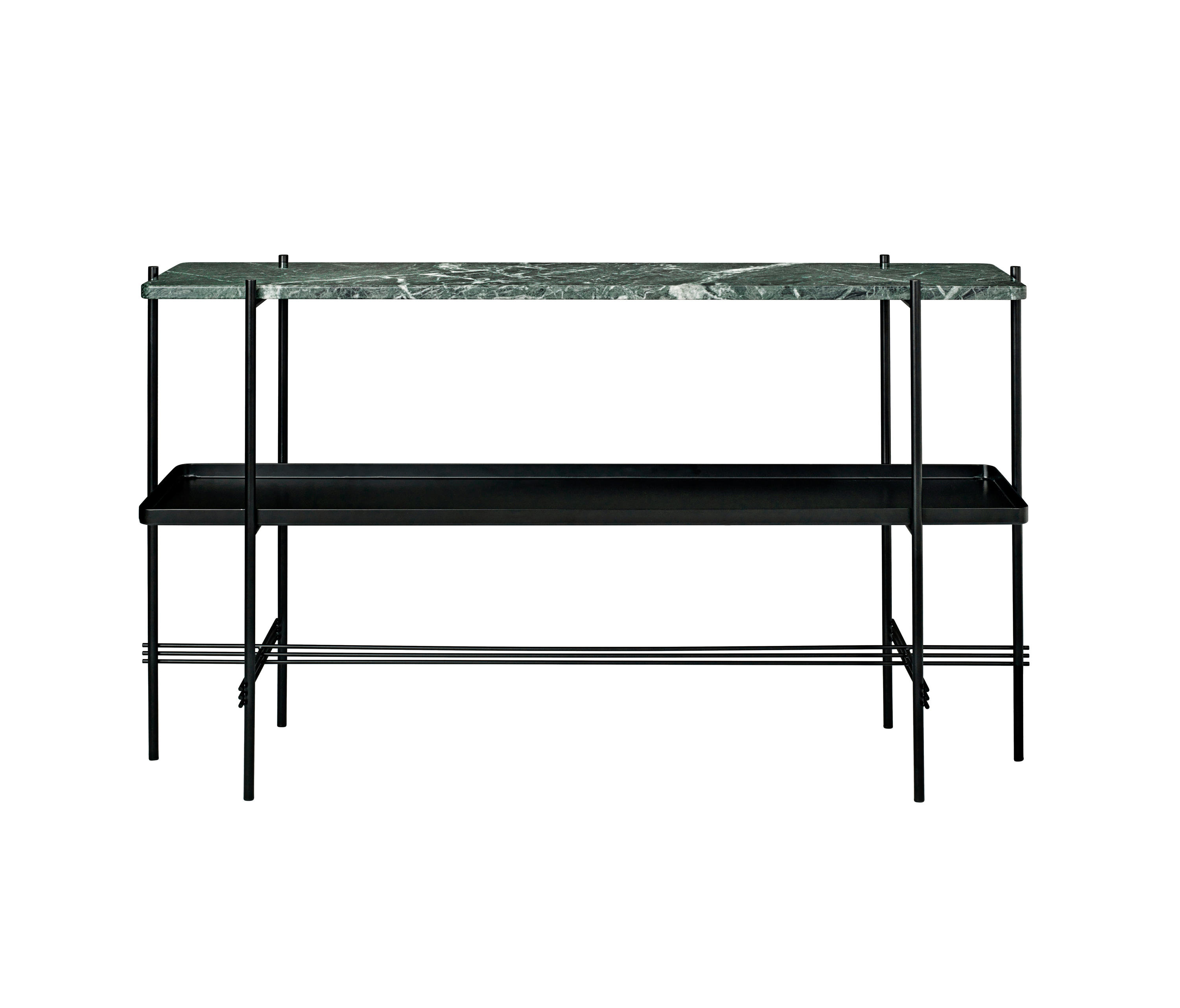 TS装饰架有两个版本——TS装饰架1和TS装饰架2。TS装饰架1有一个大理石托盘和TS装饰架2有两个大理石托盘,或一个大理石托盘和一个金属托盘。在两者上,一个黑漆框架是对比大理石顶部。